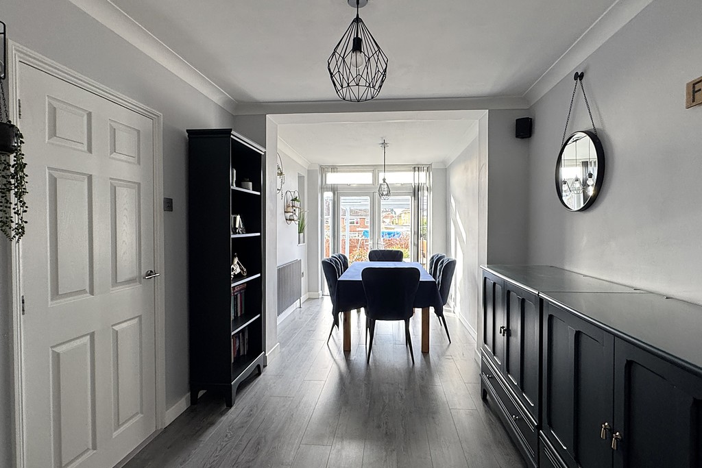 DINING ROOM 8' 8" x 19' 6" (2.66m x 5.95m) Having French doors and glazed panels with a fitted blind opening out onto the rear patio allowing plenty of natural light to fill the space. Ample room for a dining table, built-in speakers, laminate wood flooring and a door through to the kitchen.