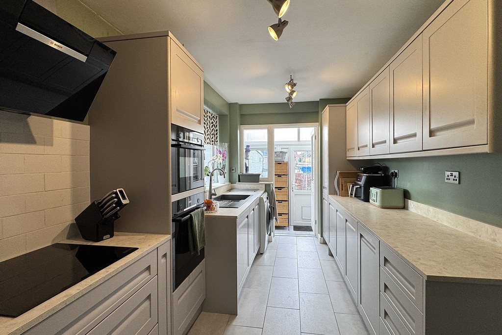 KITCHEN 8' 5" x 17' 10" (2.58m x 5.45m) Fitted with a sleek and generous range of wall, case and drawer units topped with return work surfaces, breakfast bar, composite one and a half bowl sink and drainer with mixer tap over, space and plumbing for a washing machine. Integrated Bosch appliance include and eye level single oven, Bosch combi-microwave above, induction hob, extractor and a Hotpoint dishwasher. A window to the side with a fitted roller blind, a further window and external door to the rear porch, LED lighting, space for a fridge freezer and tiled flooring.