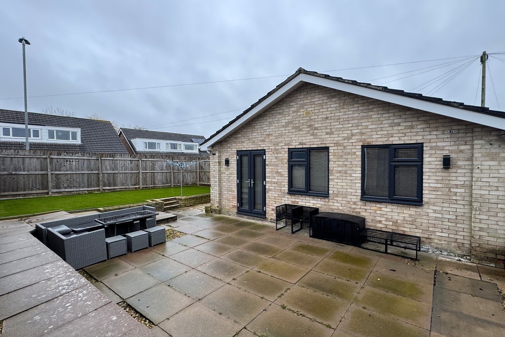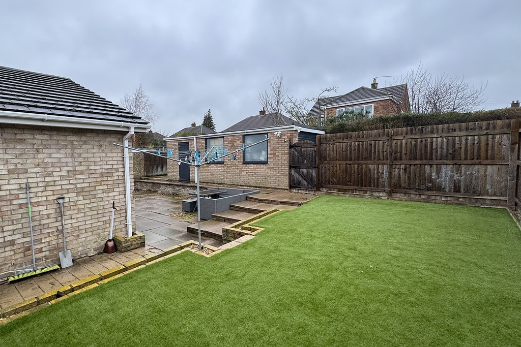 REAR GARDEN Having an extensive pave patio area adjacent to the bungalow with courtesy lighting, steps up to a raised artificial lawn, wood panel fencing to the boundary and gated access to the rear drive and garage.