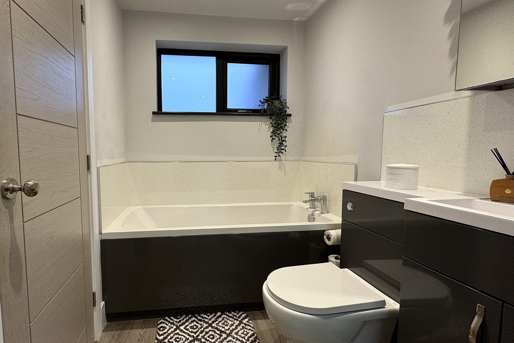 BATHROOM 5' 6" x 10' 5" (1.7m x 3.2m) Comprising of a shower cubicle with a fixed waterfall shower head and shower riser, vanity unit wash hand basin and a close coupled, push button WC, heated towel rail and a panel bath. Obscure glazed window for privacy, mermaid boarding to splash areas and LVT flooring.