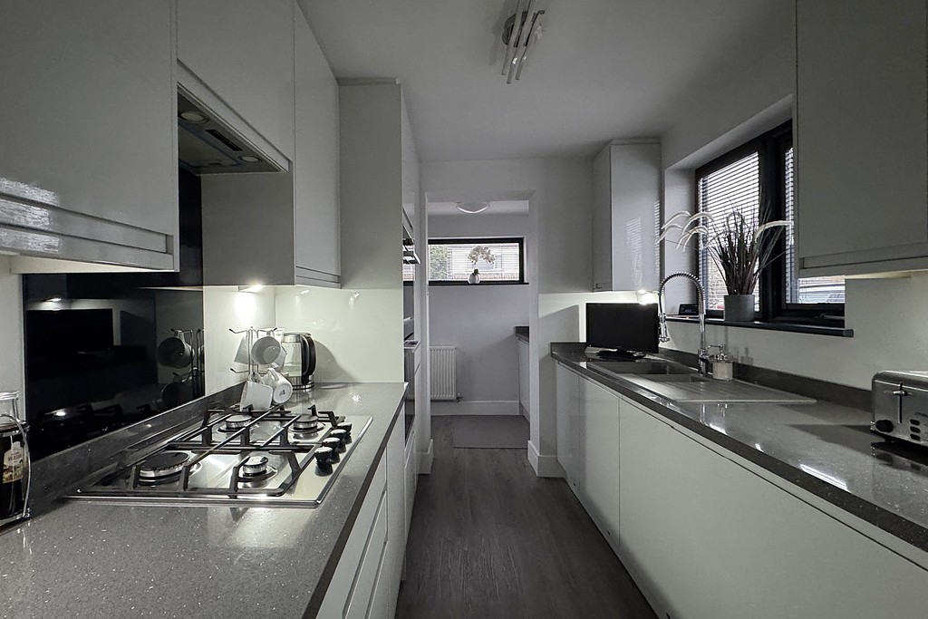 KITCHEN 16' 1" x 7' 9" (4.92m x 2.38m) Fitted with a modern range of wall, base and drawer units with under wall unit lights and low-level plinth lights. Granite work surfaces, inset with a composite one and a half bowl sink and drainer with a flexi-hose mixer tap over. Integrated appliances comprise of a dishwasher, tumble dryer, washing machine, fridge freezer, hob, extractor hood, double oven and microwave. Front facing window with integral blind, a further two windows with integral blinds and external door to the utility area, radiator and LVT flooring.