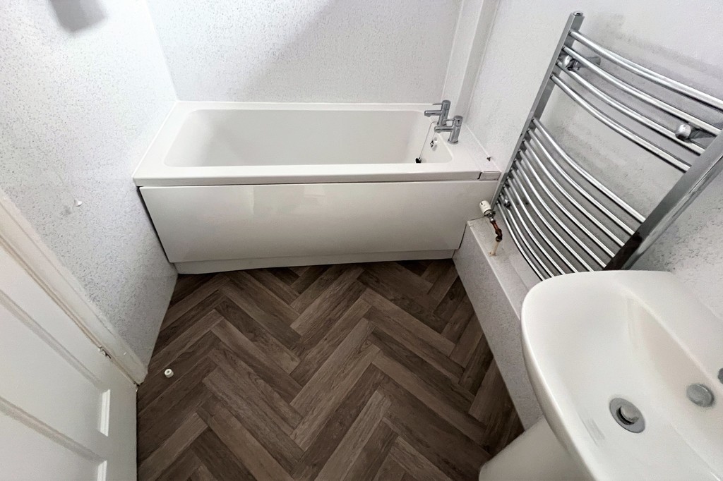 BATHROOM 6' 9" x 4' 10" (2.08m x 1.49m) Fitted with a panel bath with shower over, mermaid boarding to the walls, pedestal wash hand basin and a heated towel rail. Obscure glazed window for privacy and vinyl flooring.