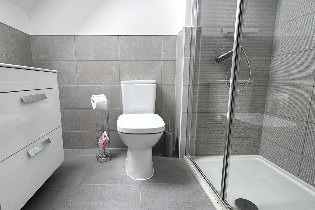 ENSUITE 7' 4" x 4' 9" (2.25m x 1.45m) A rear Velux window brings natural light into the ensuite, fitted with a white suite including a low flush WC, vanity unit wash hand basin and a double shower cubicle. Finished with tiled splash backs, tiled flooring, a heated towel rail and an extractor fan for ventilation.