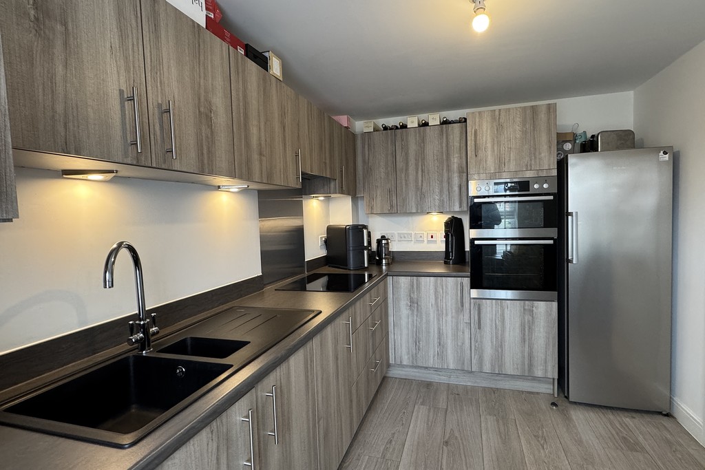 KITCHEN/DINER 11' 1" x 9' 2" (3.4m x 2.81m) With a window to the front, the kitchen is fitted with a range of wall, base and drawer units topped with work surfaces, concealed lighting and tiled splash backs. Features include a one‑and‑a‑half bowl sink and drainer, integrated double oven and grill, electric hob with pull‑down extractor hood, plumbing for a washing machine and space for a fridge‑freezer. A wall mounted and concealed Ideal boiler , radiator and tiled flooring complete the space.