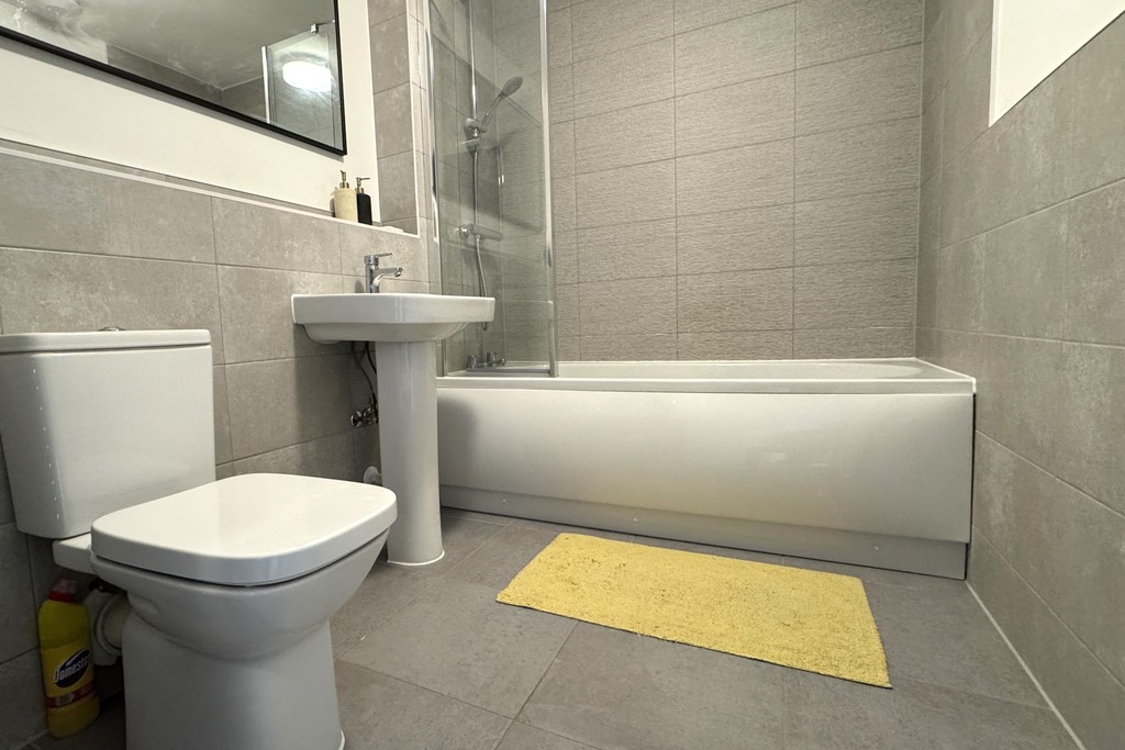 BATHROOM 8' 4" x 6' 2" (2.56m x 1.88m) Fitted with a white suite including a low flush WC, pedestal wash hand basin and a panelled bath with an independent shower and screen. Finished with tiled splash backs, tiled flooring, a heated towel rail and an extractor fan for ventilation.