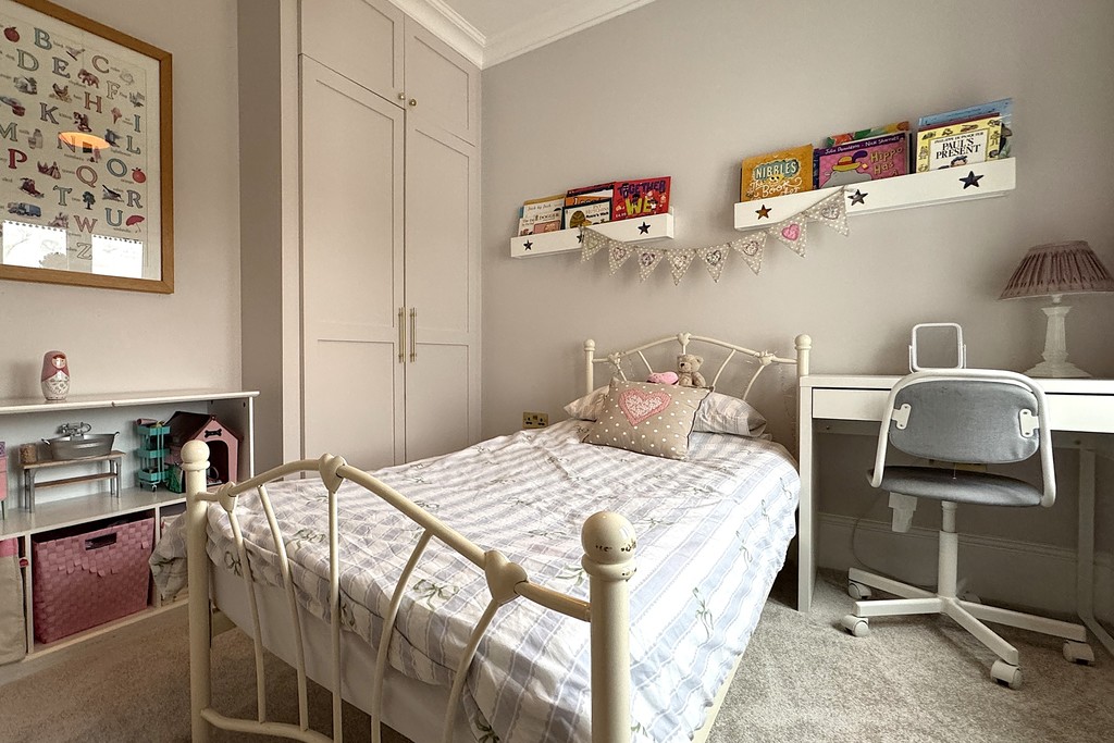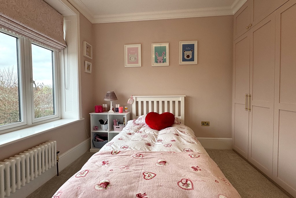 BEDROOM FOUR 9' 11" x 9' 11" (3.04m x 3.03m) Featuring a window with fitted Roman blinds, cast iron radiator, bespoke fitted wardrobes, TV aerial point, built-in cupboard and soft carpet flooring for comfort.