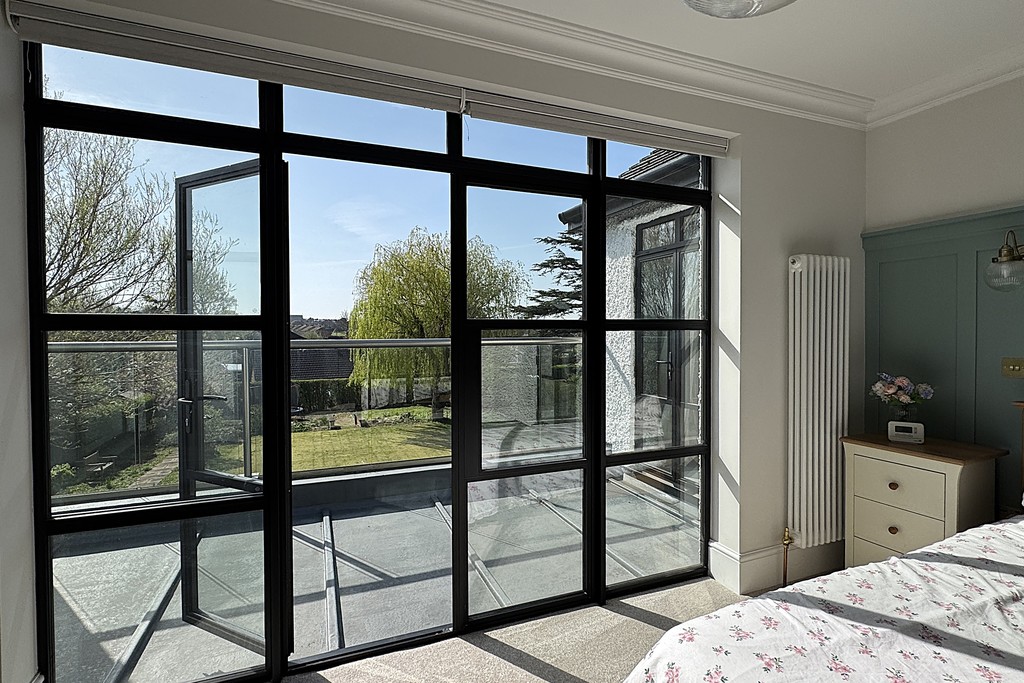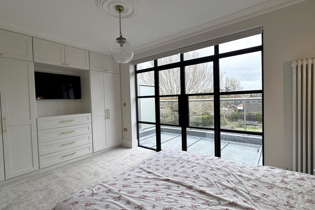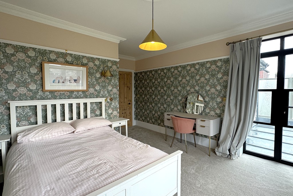 BEDROOM ONE 15' 3" x 14' 4" (4.66m x 4.38m) A generous main bedroom featuring French doors with fitted electric blinds that open onto a private balcony with views across the garden. The room includes a cast iron radiator, fitted wardrobes and drawers, a built‑in storage cupboard and USB sockets, with wood‑panelled walls adding warmth and character. Soft carpet flooring enhances the comfort, and a door leads through to the ensuite.