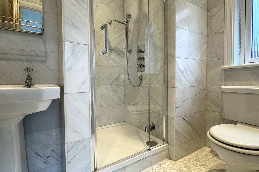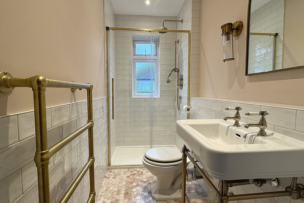 ENSUITE 4' 3" x 8' 6" (1.3m x 2.6m) Comprising a Heritage walk‑in shower cubicle with a fixed waterfall shower head and riser, a Heritage wash hand basin, dual‑flush WC and a heated towel rail. An obscure‑glazed window with fitted blind provides privacy, complemented by LED lighting and an extractor fan. The walls are part‑tiled, with Mandarin stone tiles to the floor for a high‑quality finish.