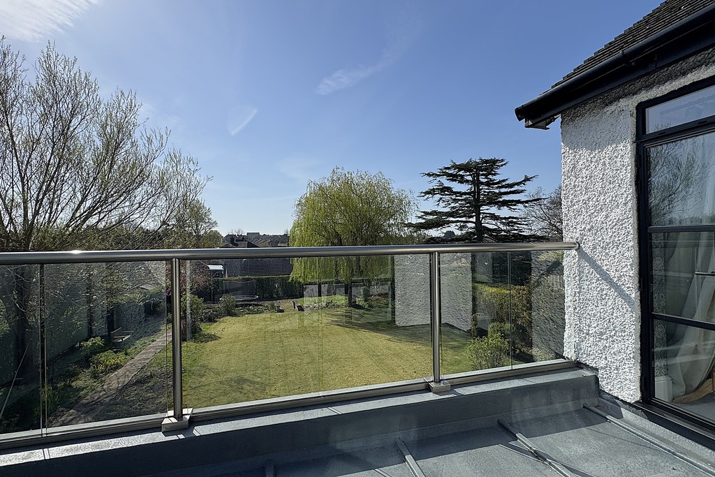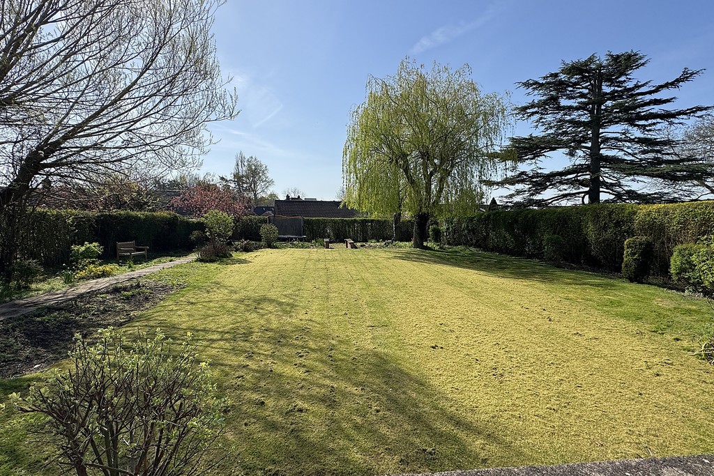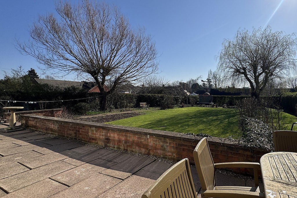 REAR GARDEN The expansive south‑facing garden is mainly laid to lawn, with a raised patio seating area adjacent to the house and steps leading down to the lawn. There are hot and cold outdoor taps and external electrical sockets for added convenience. A pathway runs down the garden, with further steps descending to a gravelled area. Mature trees and established hedging frame the boundary, creating a private and attractive outdoor space.