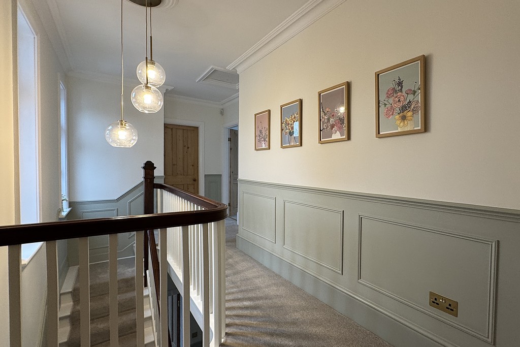 LANDING Taking the stairs to the first‑floor galleried landing, you are greeted by two windows that fill the space with natural light. Wood‑panelled walls add character, while a built‑in storage cupboard provides practicality. There is also a hatch giving access to the insulated loft space with lighting, and the area is finished with soft carpet flooring.