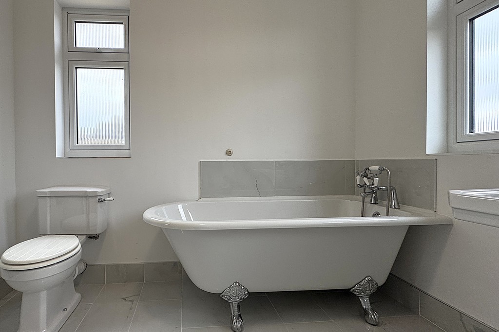BATHROOM 8' 8" x 8' 10" (2.66m x 2.70m) Comprising a freestanding roll‑top bath, low‑flush WC, pedestal wash hand basin and a heated towel rail. Two obscure‑glazed windows provide privacy and natural light, complemented by an extractor fan. The room is finished with porcelain tiled flooring for a clean, high‑quality look.