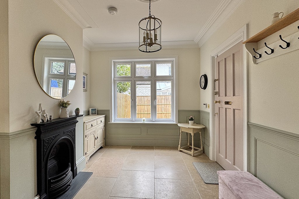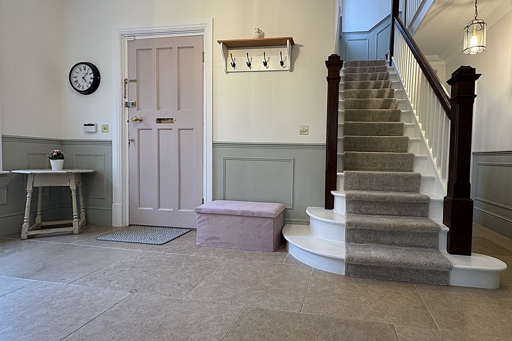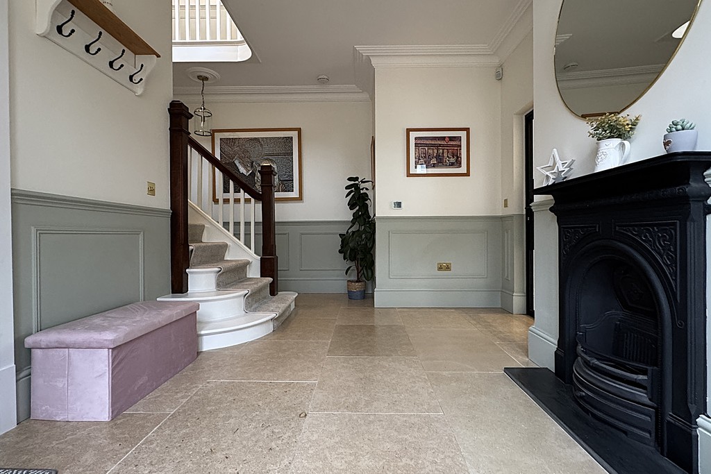 ENTRANCE HALL Entering through the welcoming entrance hall, you're met with a graceful, original oak wood staircase rising to the first floor and elegant limestone flooring with underfloor heating extending throughout the ground level. Wood‑panelled walls frame the space beautifully, complemented by a Victorian cast‑iron fireplace and a window that fills the hall with natural light. Original wooden doors lead through to the adjoining rooms.