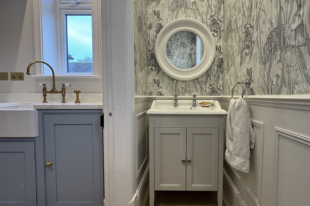 CLOAKROOM 2' 8" x 8' 5" (0.83m x 2.59m) Comprising a low‑flush WC, Heritage wash hand basin, extractor fan and an obscure‑glazed window for added privacy. The space is finished with wood‑panelled walls and limestone tiled flooring.