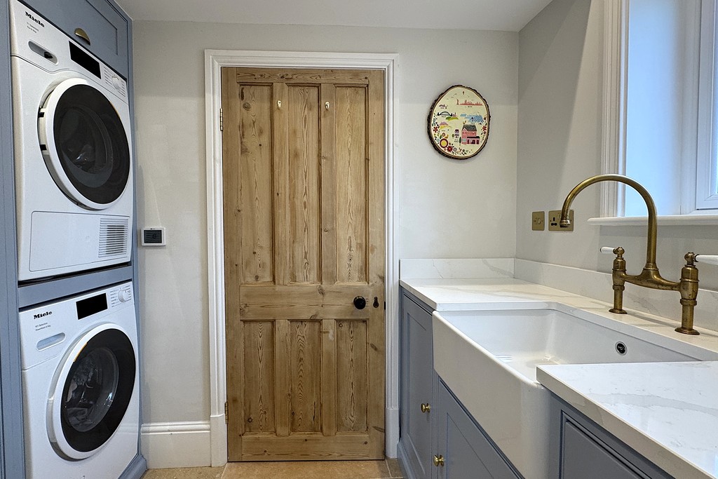 UTILITY ROOM 5' 4" x 6' 2" (1.63m x 1.89m) Fitted with a wall and base unit topped with a Quartz work surface, this practical space includes a Belfast sink and drainer with Perrin and Rowe mixer tap, along with plumbing and space for both a washing machine and a tumble dryer. A side‑facing window brings in natural light, while a built‑in cupboard provides useful storage. Limestone flooring completes the room with a durable, high‑quality finish
