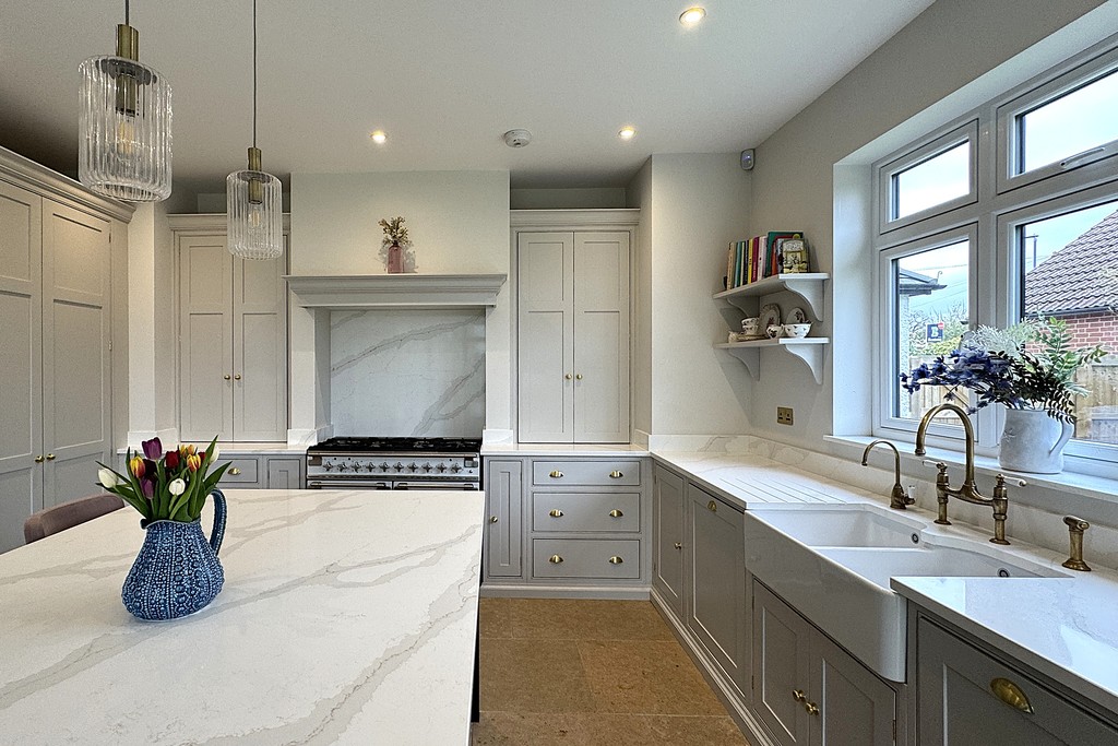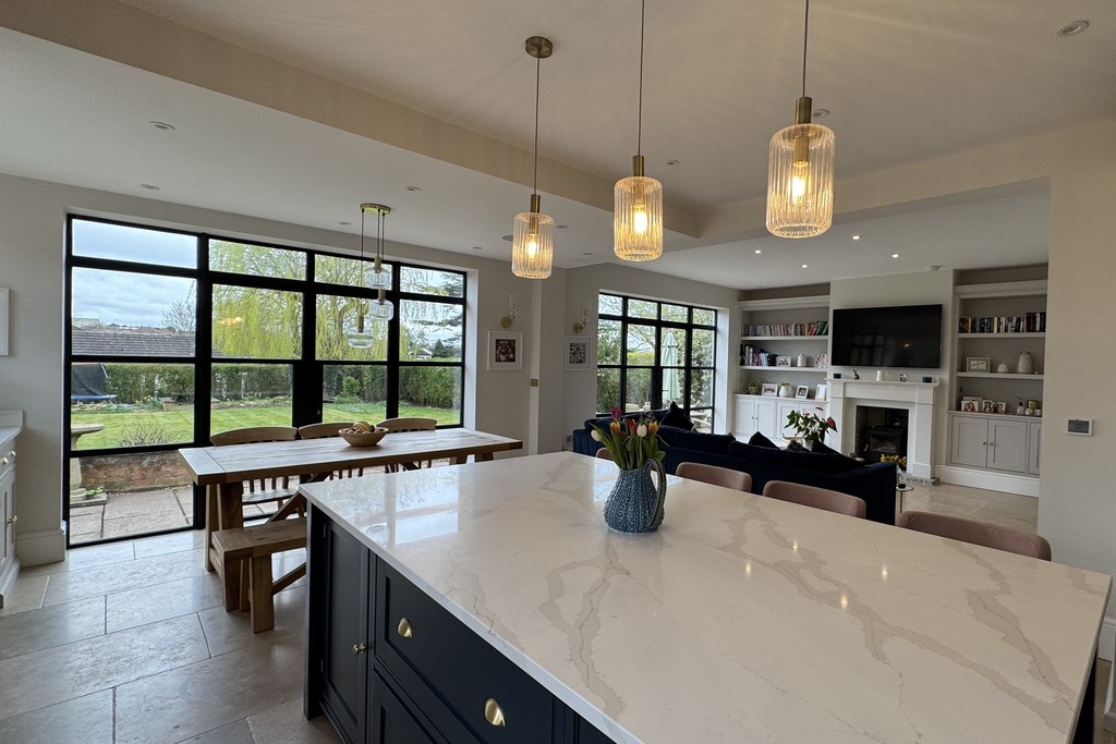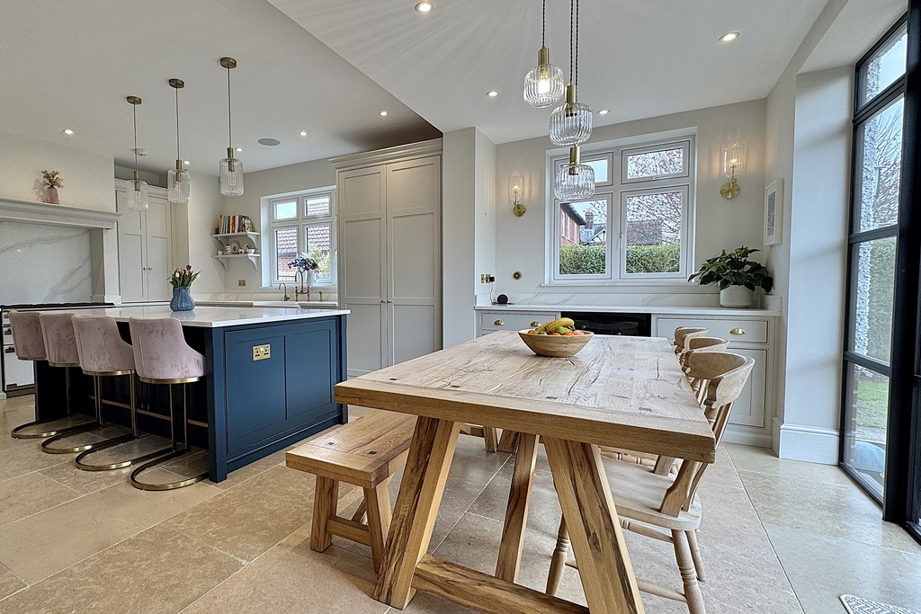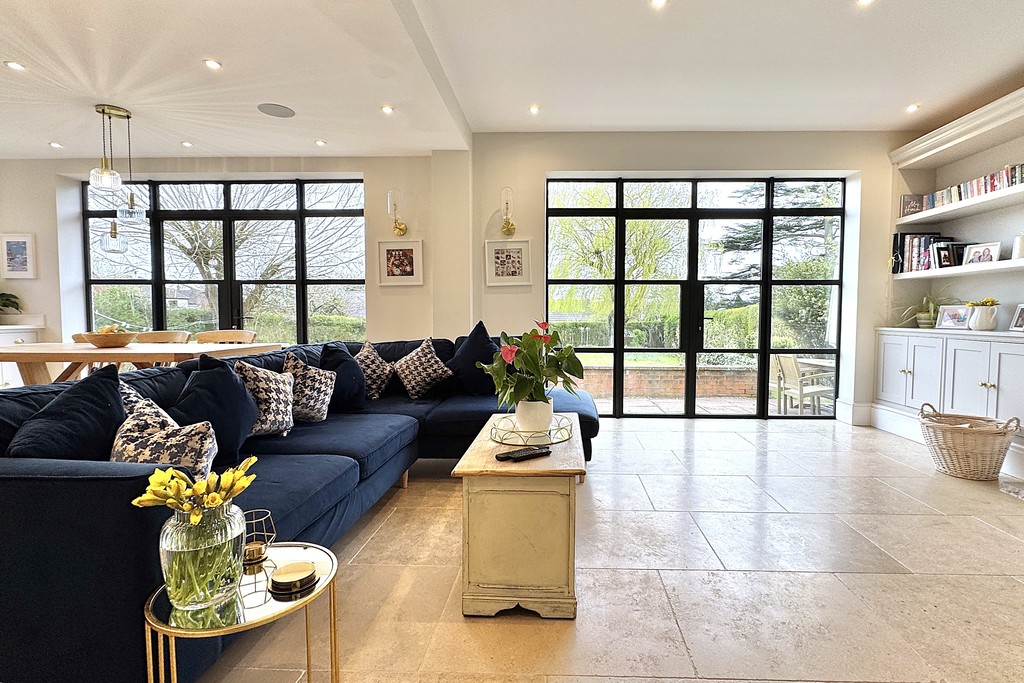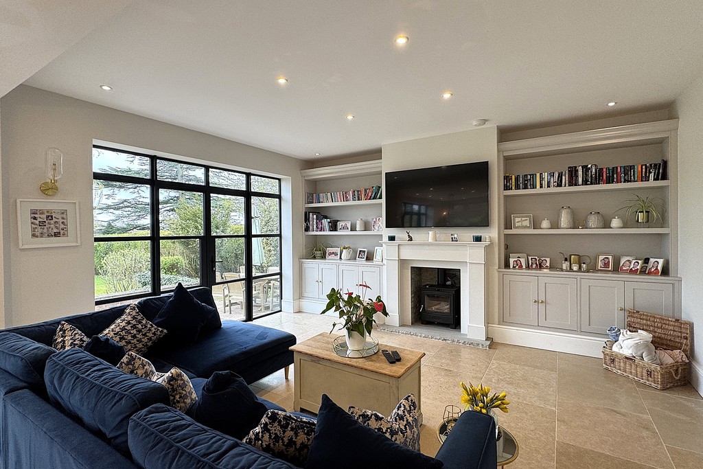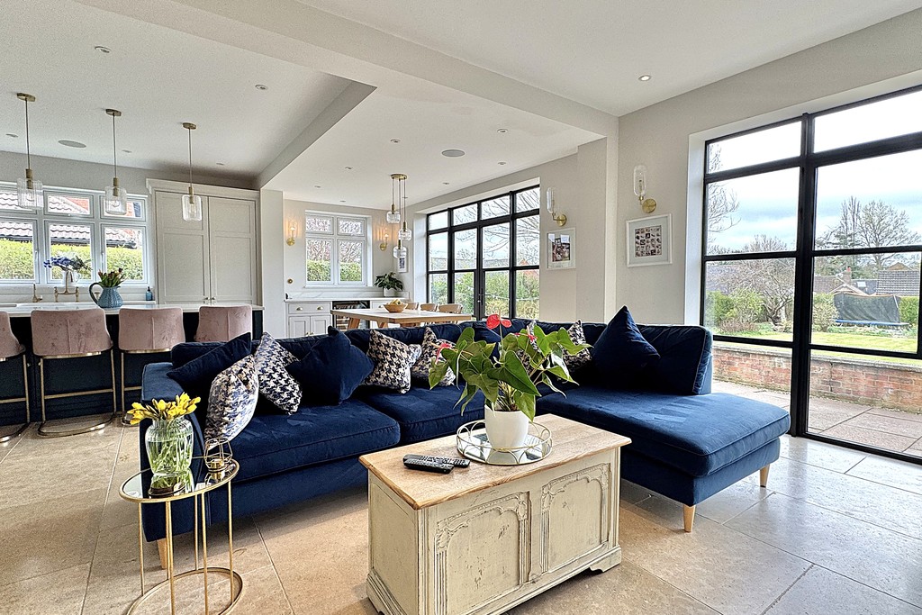 KITCHEN/DINER 23' 5" x 30' 8" (7.15m x 9.37m) A superb open‑plan space designed for modern family living, offering clearly defined kitchen, dining and lounge areas. The kitchen is fitted with contemporary wall, base and drawer units, complemented by a central island with USB ports and luxurious Calacatta Gold quartz . A Belfast sink with mixer tap is paired with a Perrin & Rowe boiling water tap, while integrated appliances include a top of the range Miele dishwasher, fridge‑freezer and a dedicated drinks fridge. A Range Master oven with six‑ring gas hob completes the culinary setup. The dining and seating area enjoys two sets of Marlin aluminum French doors and extensive glazing, ensuring the room is flooded with natural light throughout the day and the thermal performance and build quality ensure the space stays warm through the seasons. A further lounge area features a TV aerial point and a striking granite fireplace with inset log‑burner, creating a warm focal point. Additional highlights include LED and wall lighting, a Sonos sound system and limestone tiled flooring throughout.