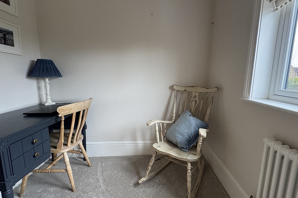 BEDROOM FIVE/STUDY 8' 8" x 7' 1" (2.65m x 2.18m) A single bedroom, ideal as a nursery or home office, featuring a window with a fitted blind, cast iron radiator and soft carpet flooring.