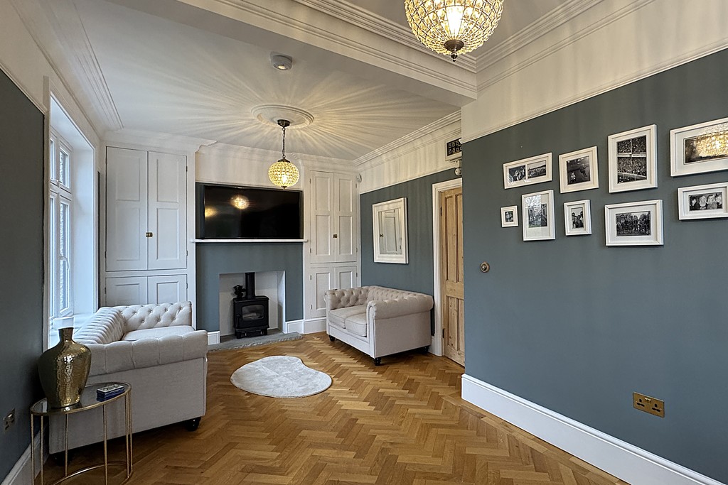 SITTING ROOM 8' 10" x 22' 3" (2.7m x 6.8m) Enjoying dual‑aspect windows that draw in abundant natural light, this inviting room features elegant parquet wood flooring and a striking log‑burner set on a stone hearth. Built‑in cupboards sit neatly within the alcoves, with a TV aerial point for convenience, and an external door offering direct access to the garden.
