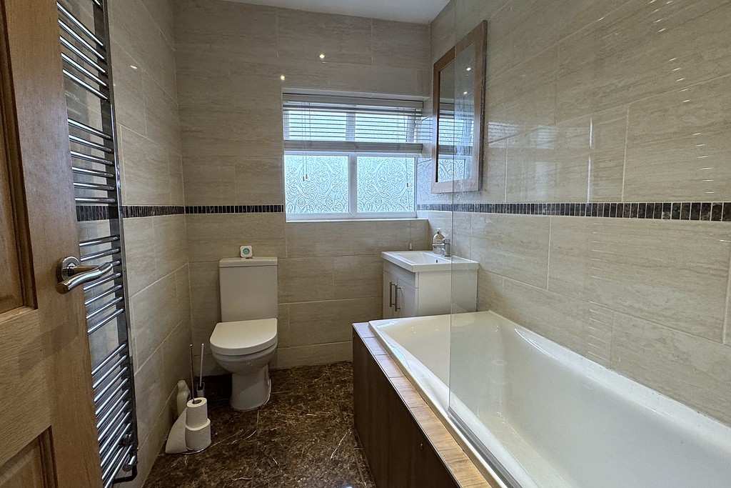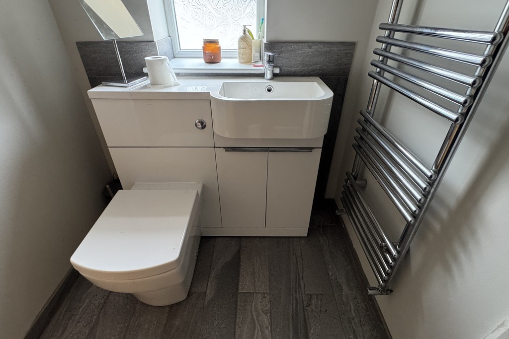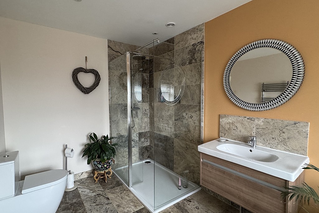 ENSUITE 4' 8" x 9' 5" (1.43m x 2.88m) Vanity unit wash hand basin and WC, shower cubicle and a heated towel rail. Obscure glazed window for privacy, LED lighting and tiled flooring.