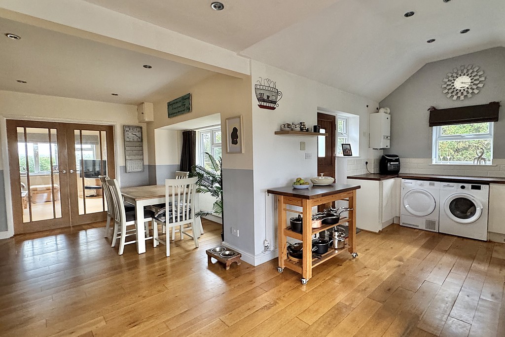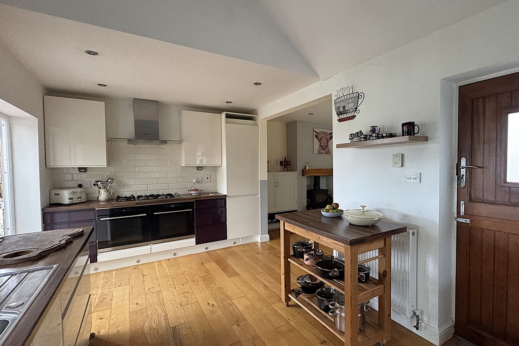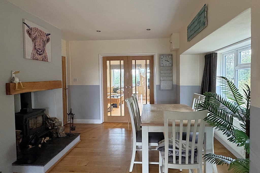 DINING ROOM 11' 10" x 13' 5" (3.62m x 4.10m) Having a large walk-in bay window framing picturesque views across the garden and paddock, an ideal backdrop for relaxed meals or lively gatherings. A multi-fuel log burning stove with a beam mantle and tiled hearth, radiator and fitted storage cupboards. Engineered oak flooring continues seamlessly into the open-plan kitchen, tying the spaces together.