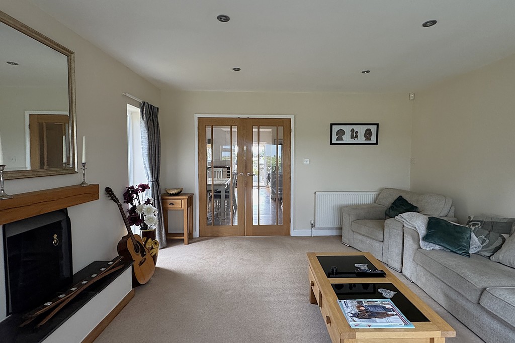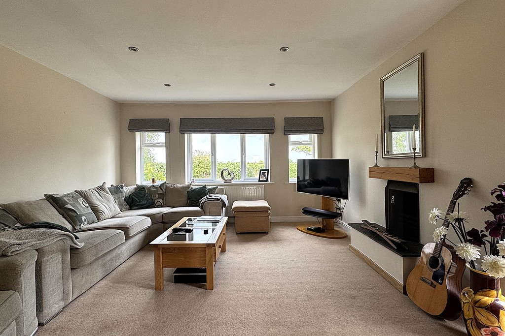 LOUNGE 14' 9" x 13' 9" (4.52m x 4.2m) Having three front facing windows with fitted roman blinds and a picture window to the side, allowing plenty of natural light to fill the large reception room. Central open fireplace with a beam mantle, two radiators, LED lighting, carpet flooring and glazed French doors through to the dining area.
