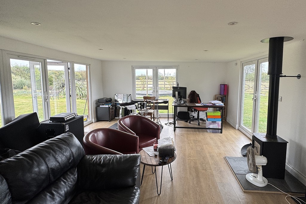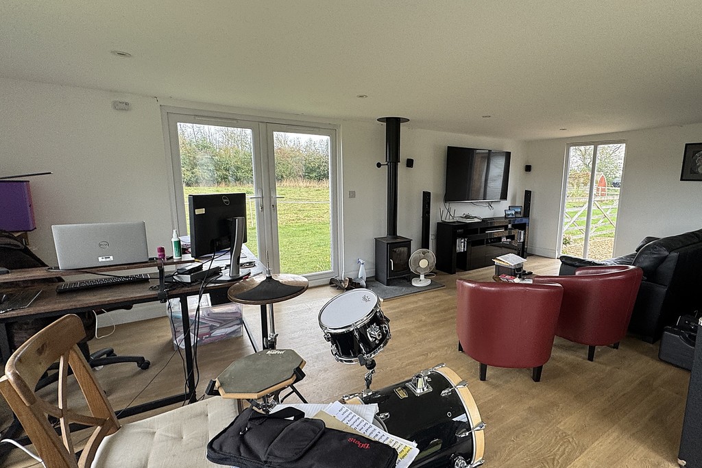 GARDEN ROOM 15' 7" x 21' 7" (4.75m x 6.58m) This fully insulated timber garden office offers a peaceful retreat or working space. Having a multi-fuel log burner ensuring comfort throughout the seasons, TV aerial point, internet connection, LED lighting and laminate wood flooring throughout for easy maintenance.