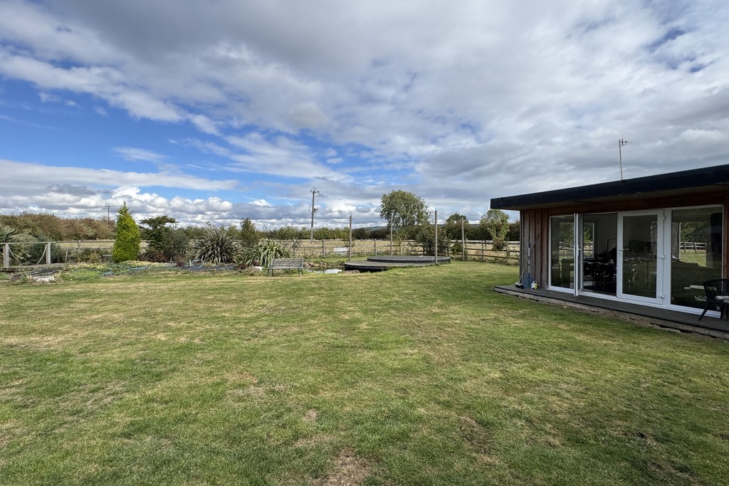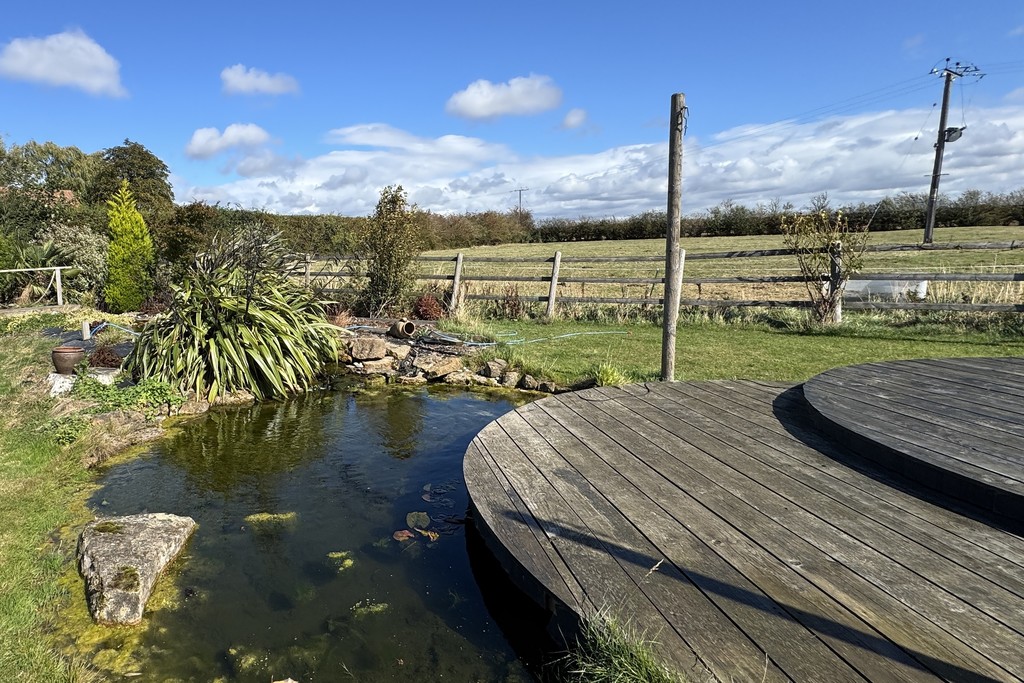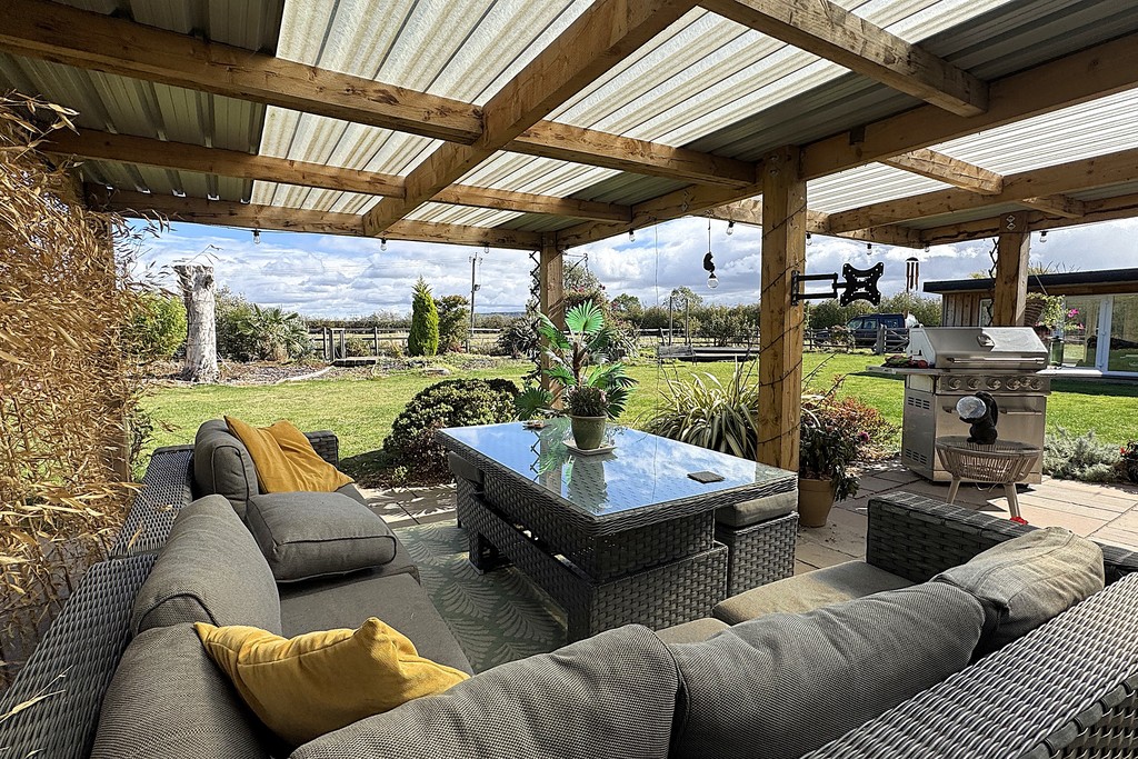 GARDENS Extensive gardens envelop the property with sensory courtesy lighting and both front and rear outside taps and electrical sockets. Having a generous gravel driveway providing off road parking and a gravel area to the rear for secure caravan storage. A covered patio seating area provides a great space to entertain and enjoy summer barbeques. Throughout the lawned grounds are many fruit trees, mature shrubs and trees and an ornamental pond with a decked seating area. A Nissen hut provides handy storage with power connected. Post and rail fencing with five bar gates secures the two grassed paddock areas.