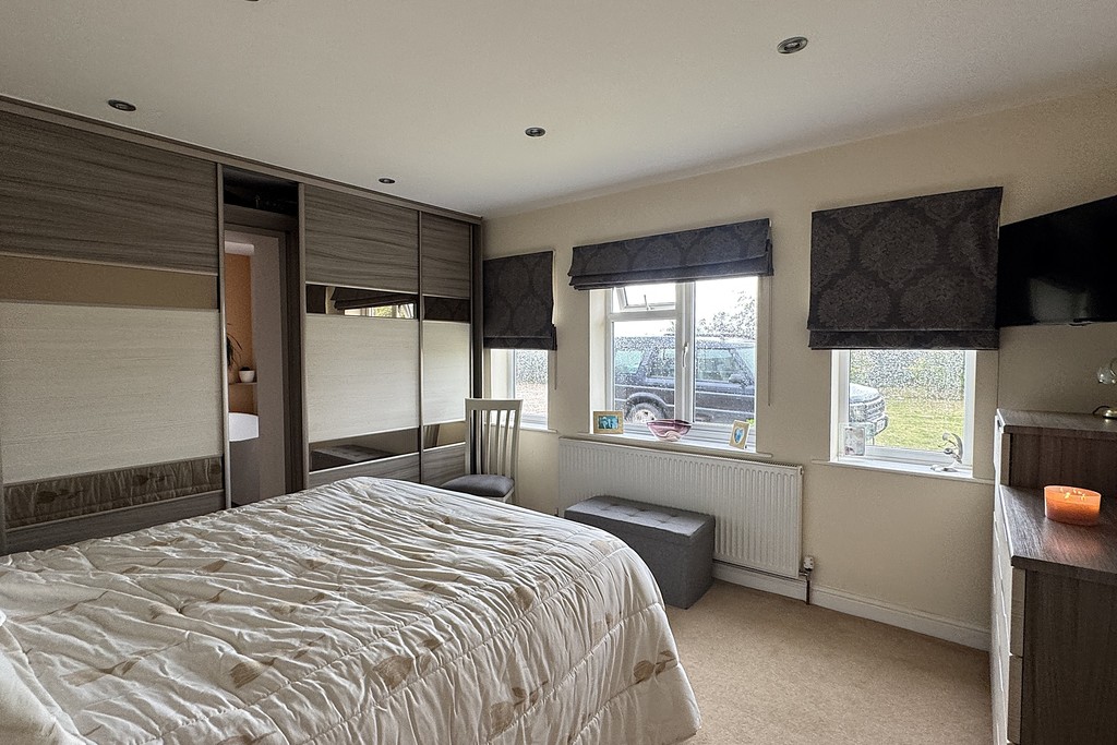 BEDROOM ONE 11' 10" x 12' 7" (3.62m x 3.86m) Having three front facing windows fitted with roman blinds, radiator, built-in wardrobes, carpet flooring and a door to the ensuite.