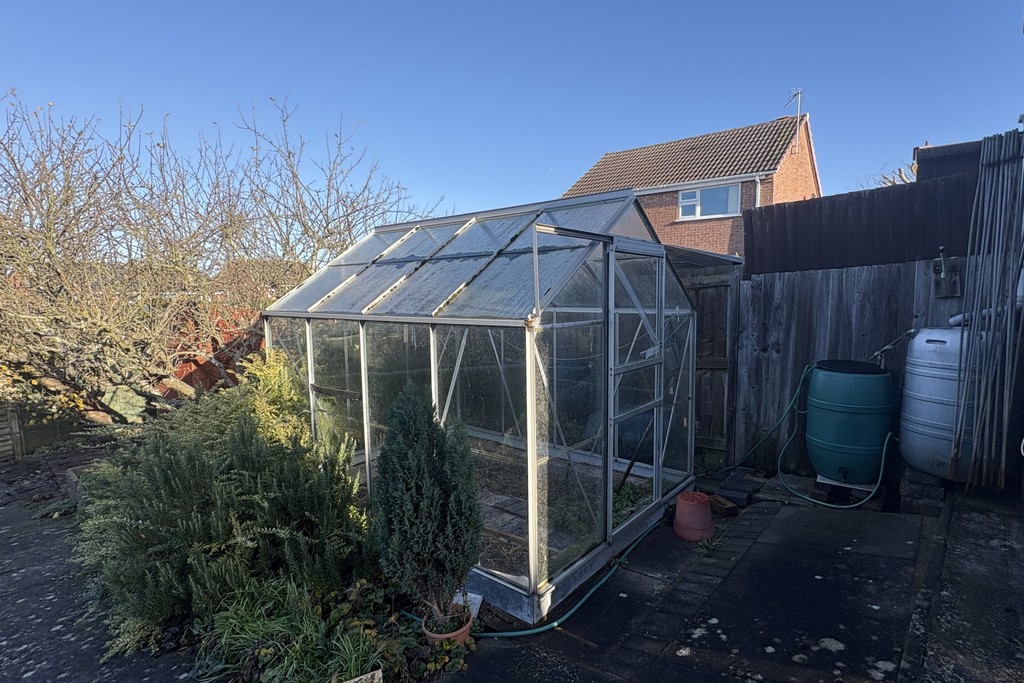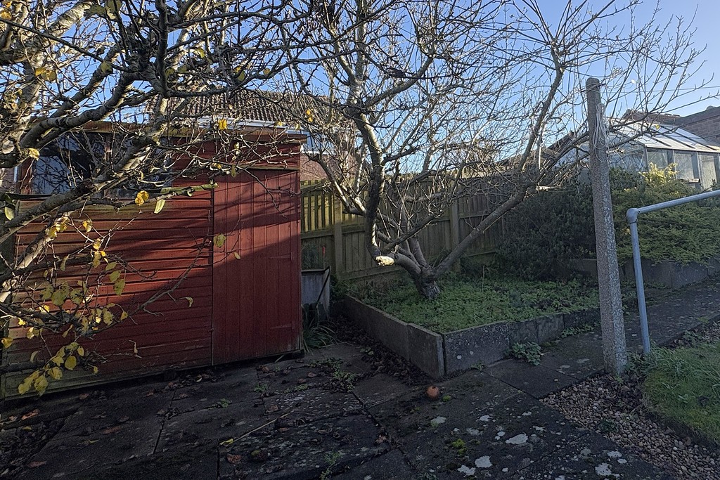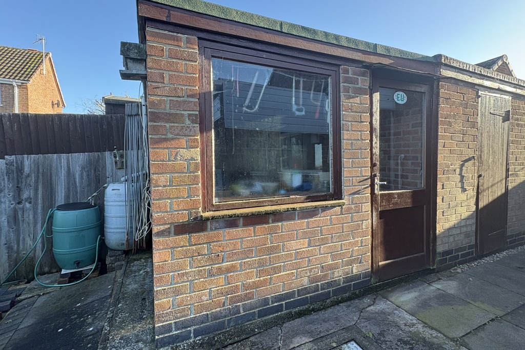 REAR GARDEN A covered paved patio sits directly beside the bungalow, perfect for relaxing or entertaining, with a pathway leading down to a further patio that elegantly frames the lawn. The garden is well-equipped with a greenhouse, a timber shed, garden tap and a substantial brick-built workshop, offering excellent versatility for hobbies or storage. Boundaries are defined by wood panel fencing and mature shrubs, creating privacy and greenery, while a gated access to the front ensures convenience.