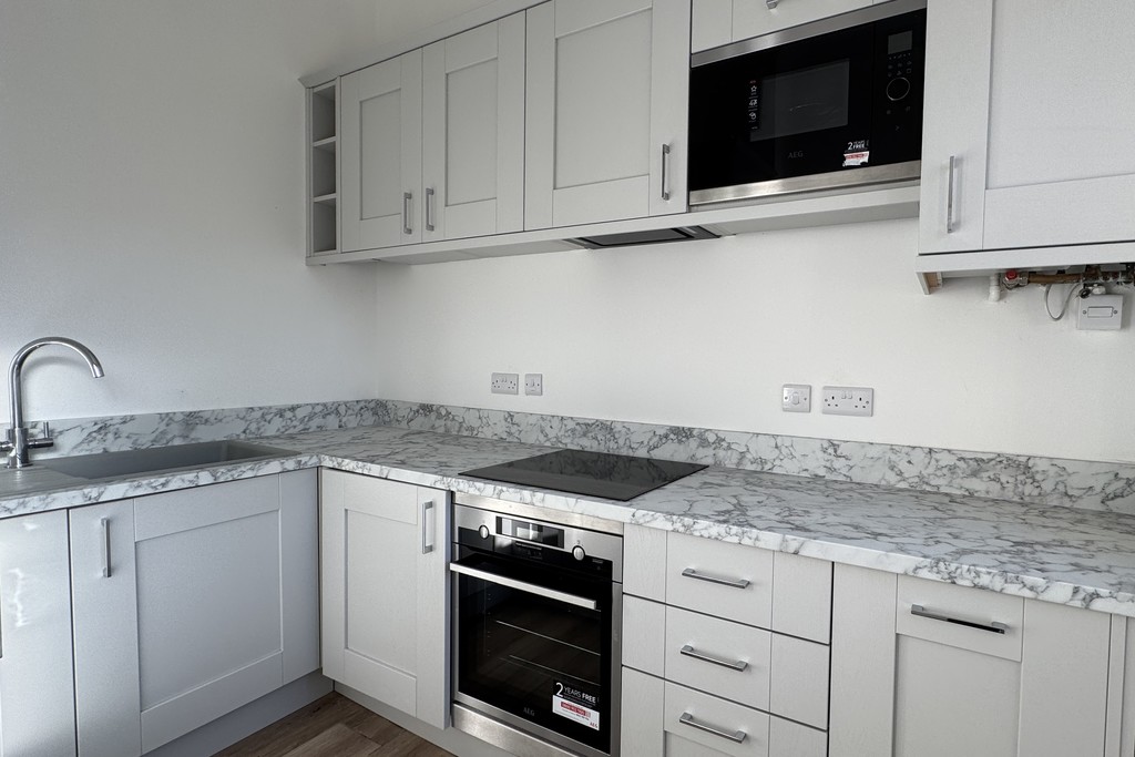 KITCHEN 10' 0" x 8' 1" (3.07m x 2.48m) Featuring a modern selection of wall, base, and drawer units topped with return work surfaces, along with a Blanco sink and drainer fitted with a mixer tap. Integrated appliances include an Indesit washer/dryer, fridge, freezer, Bloomberg dishwasher, and AEG microwave, oven, and induction hob with extractor hood. A wooden sash window with a fitted blind overlooks the gardens, while an A-rated Worcester combination boiler is neatly concealed within a wall unit. The space is finished with tiled flooring.