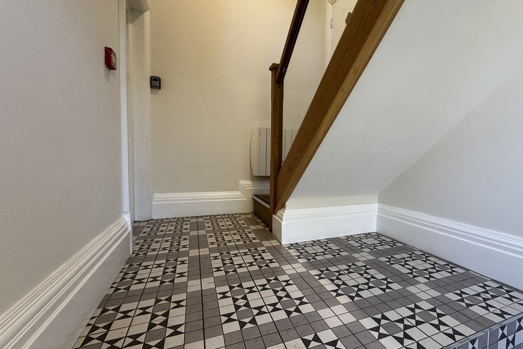 COMMUNAL ENTRANCE HALL Steps lead up to the main entrance with a glazed door opening into the communal entrance hall with video entry system, tiled flooring, radiator, oak stairs rising to the first and second floors and a door to Apartment 4 on the ground floor.