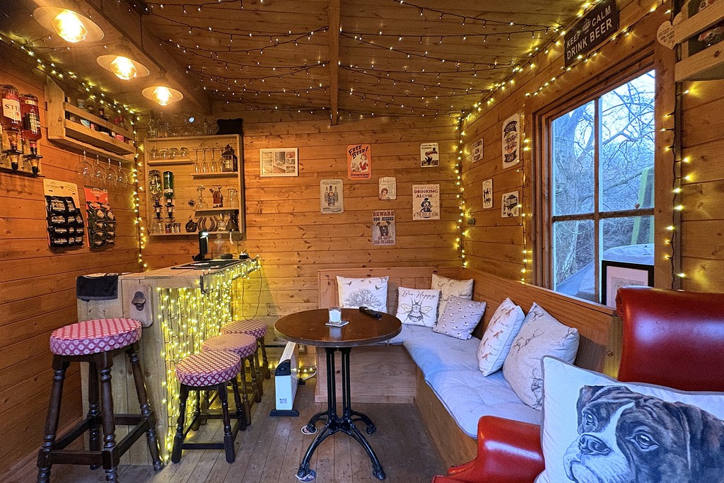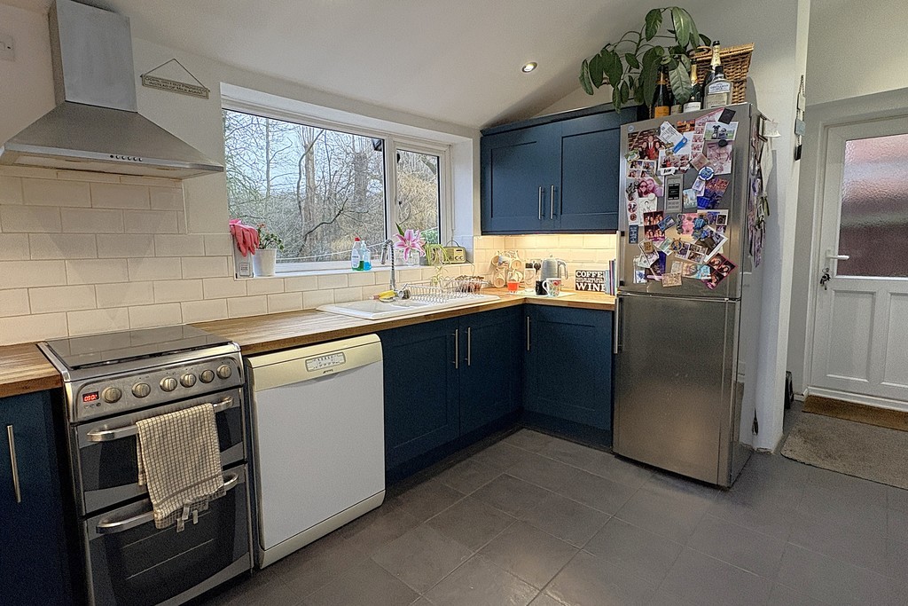 KITCHEN 9' 1" x 13' 0" (2.79m x 3.97m) Fitted with a generous range of modern wall, base and drawer units topped with solid wood work surfaces, tiled splash backs, ceramic sink and drainer unit, space and plumbing for a dishwasher, space for a freestanding cooker with extractor hood over and space for a freestanding fridge freezer. Two windows take in views of the rear garden and woodland beyond, two Velux windows ensuring plenty of natural light, inset LED lighting and tiled flooring continuing down to the utility area.