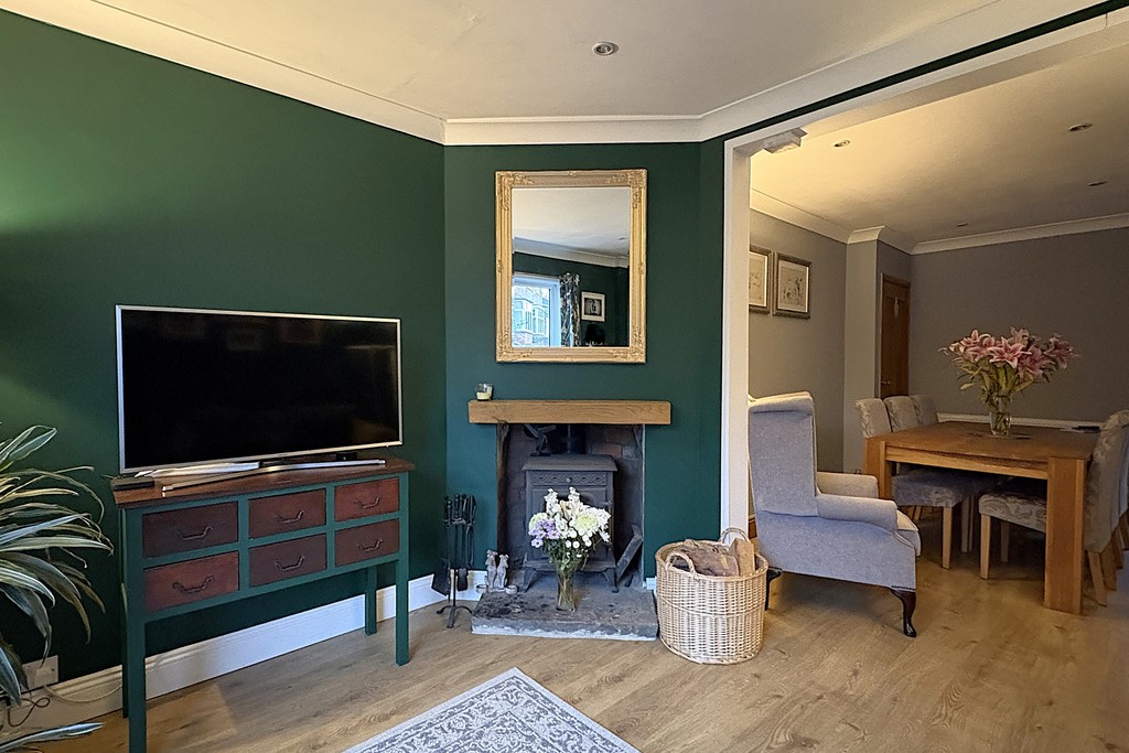LOUNGE 9' 7" x 12' 0" (2.93m x 3.67m) Having a front facing window, radiator, fireplace inset with a log burner, TV aerial point, inset LED lighting, wall up lights and laminate wood flooring continuing through to the dining room.