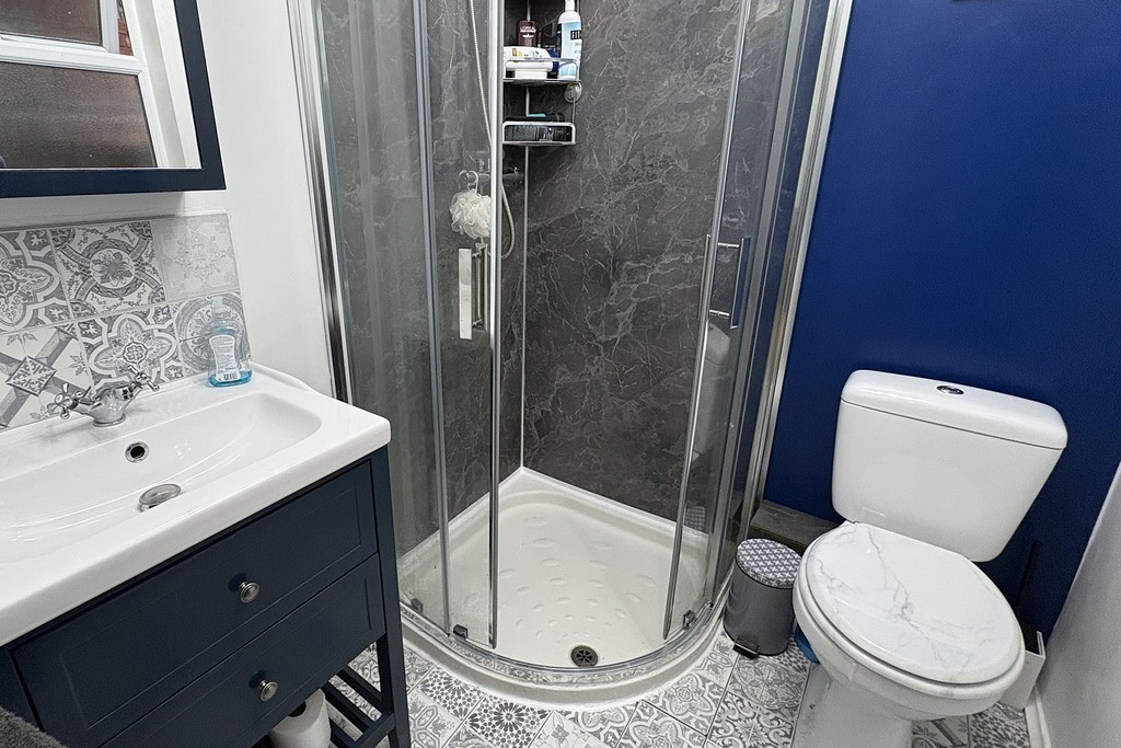 SHOWER ROOM 5' 5" x 4' 9" (1.67m x 1.47m) Comprising of a shower cubicle with a fixed waterfall shower head and shower riser, dual flush WC, vanity unit wash hand basin with wall cabinet over and a heated towel rail. Obscure glazed window for privacy, extractor fan, tiled splash back and laminate flooring.