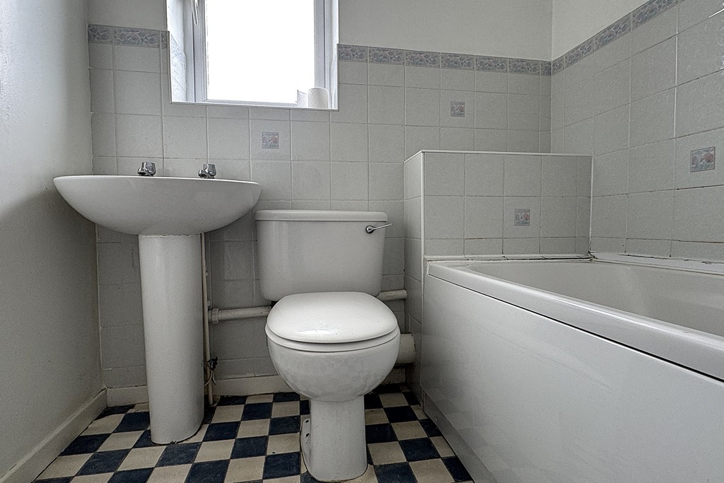 BATHROOM 6' 2" x 6' 0" (1.9m x 1.83m) Comprising of a panel bath with shower over, pedestal wash hand basin and a low flush WC. Obscure glazed window for privacy, radiator, extractor fan and vinyl flooring.