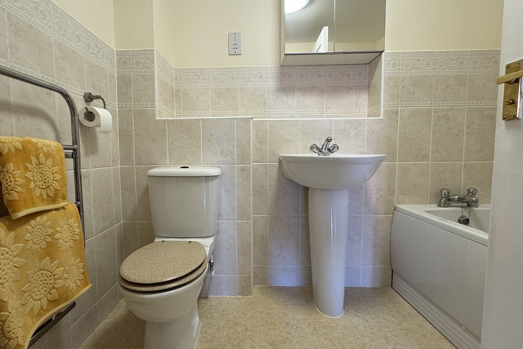 BATHROOM 7' 8" x 6' 3" (2.36m x 1.91m) Comprising of a panel bath, pedestal wash hand basin and a low flush WC. Heated towel rail, electric shaver socket, extractor fan and vinyl flooring.