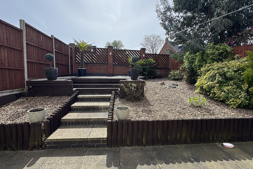 REAR GARDEN Hard landscaped for easy maintenance with a paved patio adjacent to the property with garden tap, steps rise up to a further decked seating area flanked by gravel beds which are bordered with mature shrubs. Wood panel fencing secures the boundary with gated access to the staircase down to the garage.