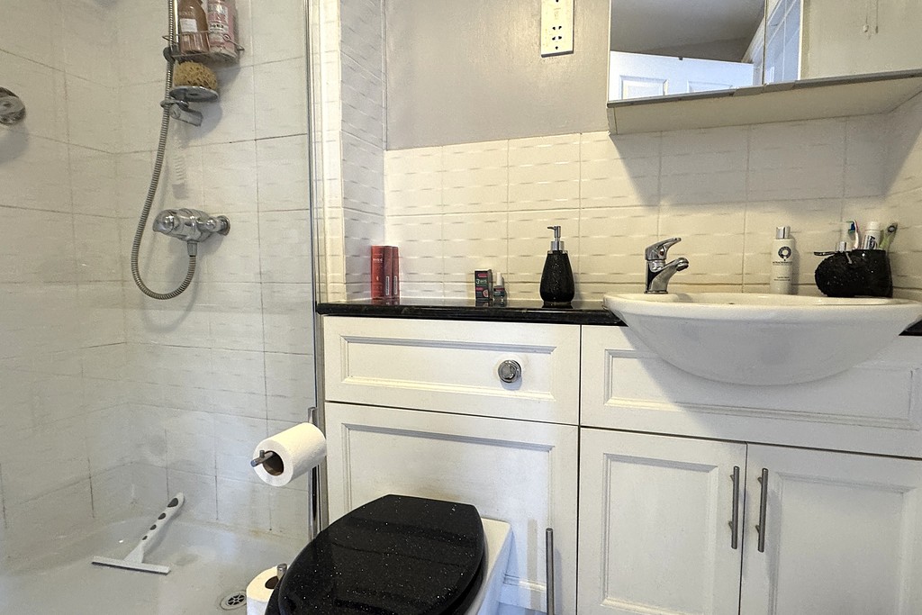 ENSUITE 6' 1" x 6' 10" (1.87m x 2.09m) Comprising of a shower cubicle, low flush WC and a pedestal wash hand basin. Heated towel rail, electric shaver points, extractor fan and tiled flooring.