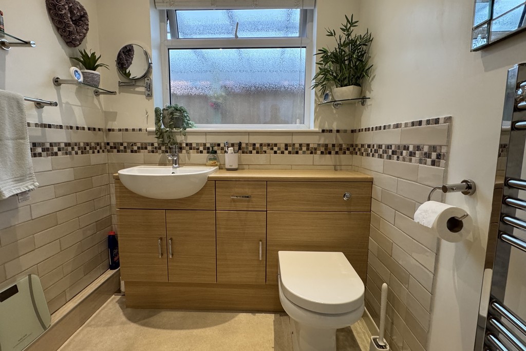 SHOWER ROOM 5' 9" x 8' 8" (1.76m x 2.65m) Comprising of a corner shower cubicle with a Mira mixer shower, heated towel rail, vanity unit wash hand basin and a close coupled WC. Obscure glazed window for privacy, part tiled walls and vinyl flooring.