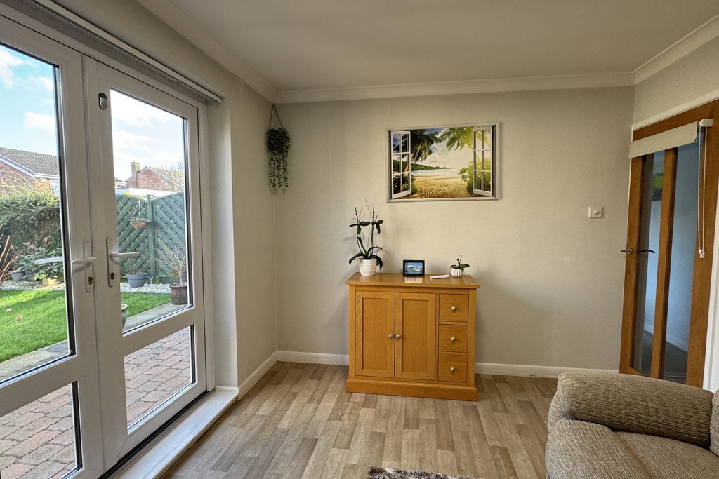BEDROOM TWO 11' 5" x 9' 9" (3.49m x 2.98m) Currently used as a sitting room, having French doors with fitted blinds to the rear garden, radiator and vinyl flooring,