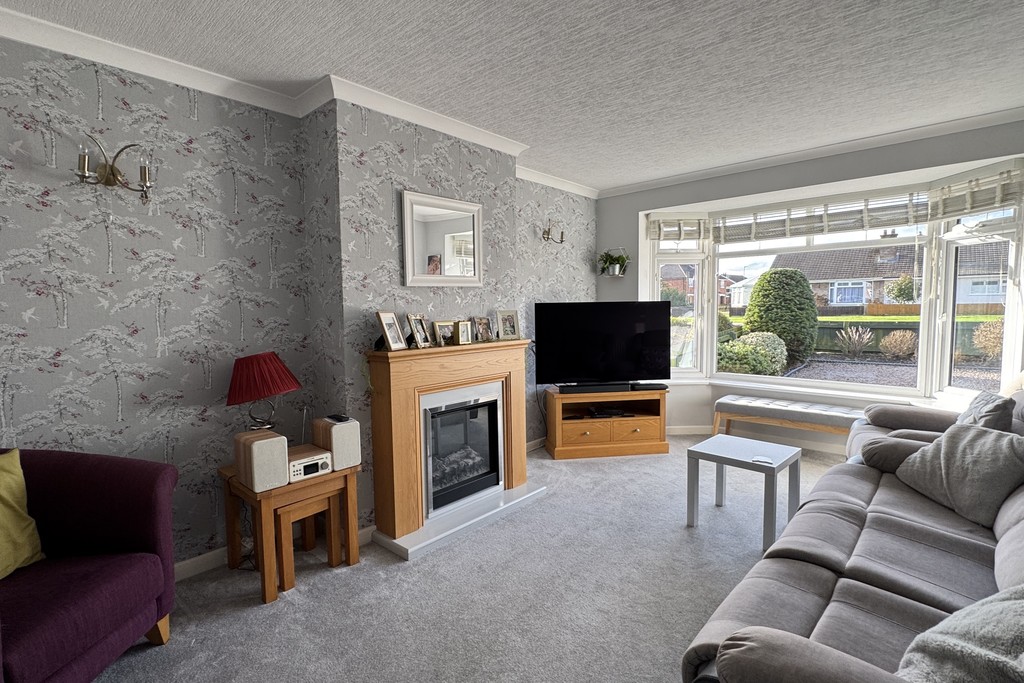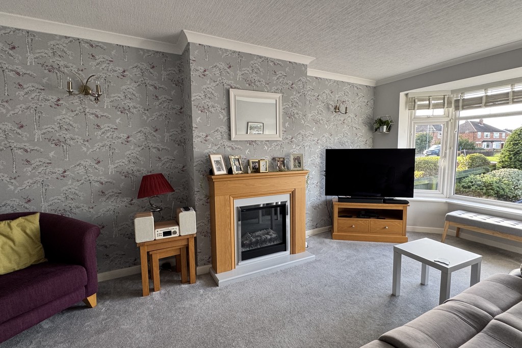 LOUNGE 11' 2" x 18' 1" (3.42m x 5.52m) A nicely proportioned room having a front facing bay window with fitted blinds, radiator, TV aerial point, feature oak fireplace with electric fire, three wall lights and carpet flooring. Oak glazed door to the inner hall.