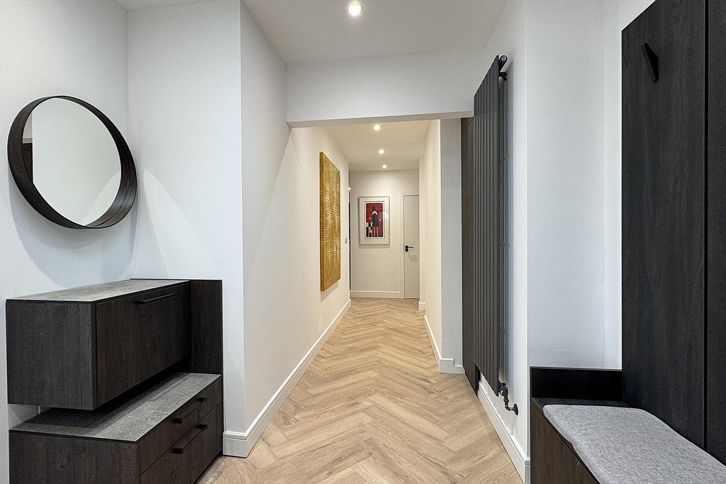 HALLWAY Having inset LED lighting, discreet panel housing the fuse box and electricity meter, continuation of the Herringbone wood flooring, vertical radiator and doors off to;