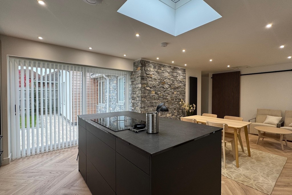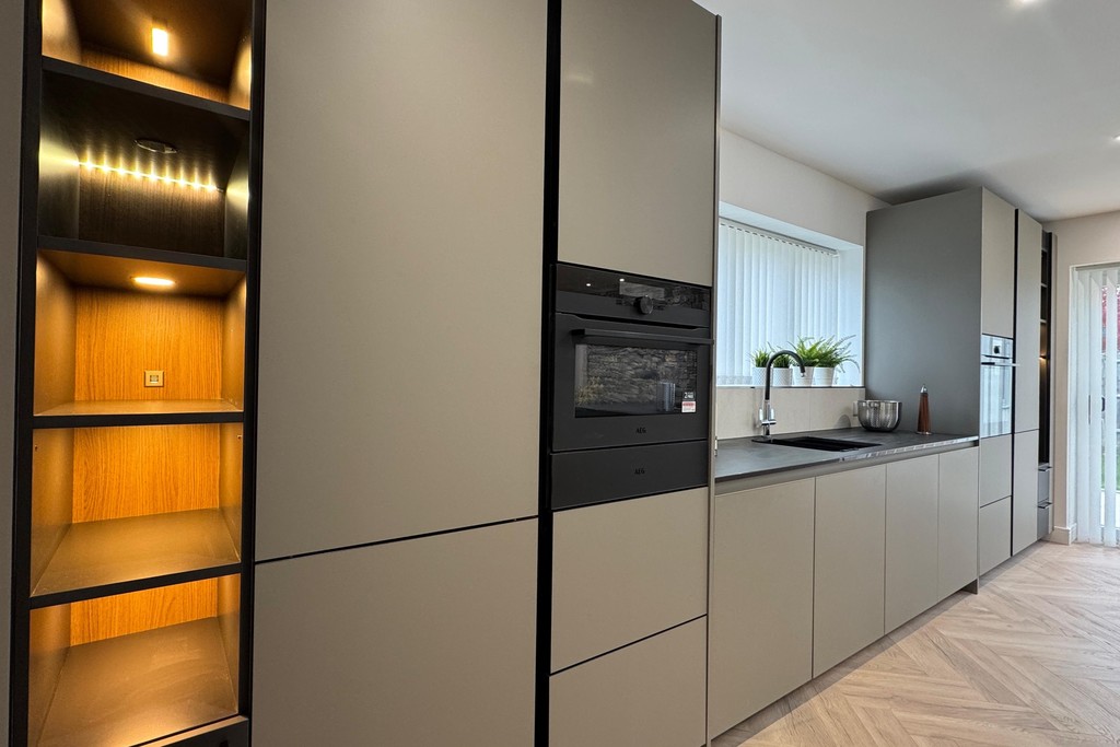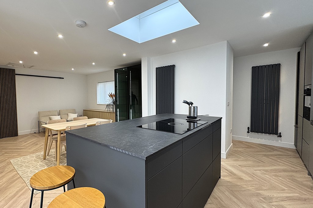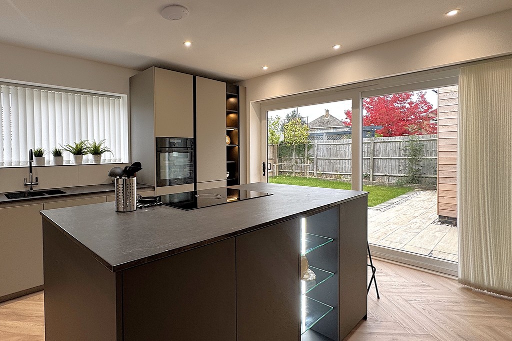 KITCHEN/DINER 14' 7" x 25' 1" (4.45m x 7.65m) Step into a sleek, open-plan kitchen diner designed for effortless entertaining and everyday comfort. With generous space for both a dining table and a cozy seating nook, this stylish hub invites relaxed gatherings and lively dinner parties alike. The kitchen showcases a contemporary suite of streamlined units topped with luxurious granite work surfaces. A Capel Italian one-and-a-half bowl sink with mixer tap sits beneath tiled splash backs, while LED-lit display cabinets with USB sockets add a soft, ambient glow come evening. At the heart of the room, a central island offers both form and function featuring an Elica ceramic venting hob, self-closing drawers, illuminated shelving, and ample storage. Integrated appliances include a Miele dishwasher and fridge freezer, plus an AEG eye-level electric oven, combination microwave/oven, and warming drawer, all seamlessly built in for a clean, modern finish. Bathed in natural light from dual-aspect windows, patio doors to the garden, and a Velux ceiling window, this inviting space feels bright and uplifting throughout the day. All openings are fitted with sleek blinds for privacy and light control. Nordic stone and slatted wood paneling add tactile warmth and visual interest to select walls, creating a subtle nod to Scandinavian design. Three vertical radiators ensure cosy comfort year-round, while inset LED lighting and elegant herringbone wood flooring complete the look with modern sophistication.
