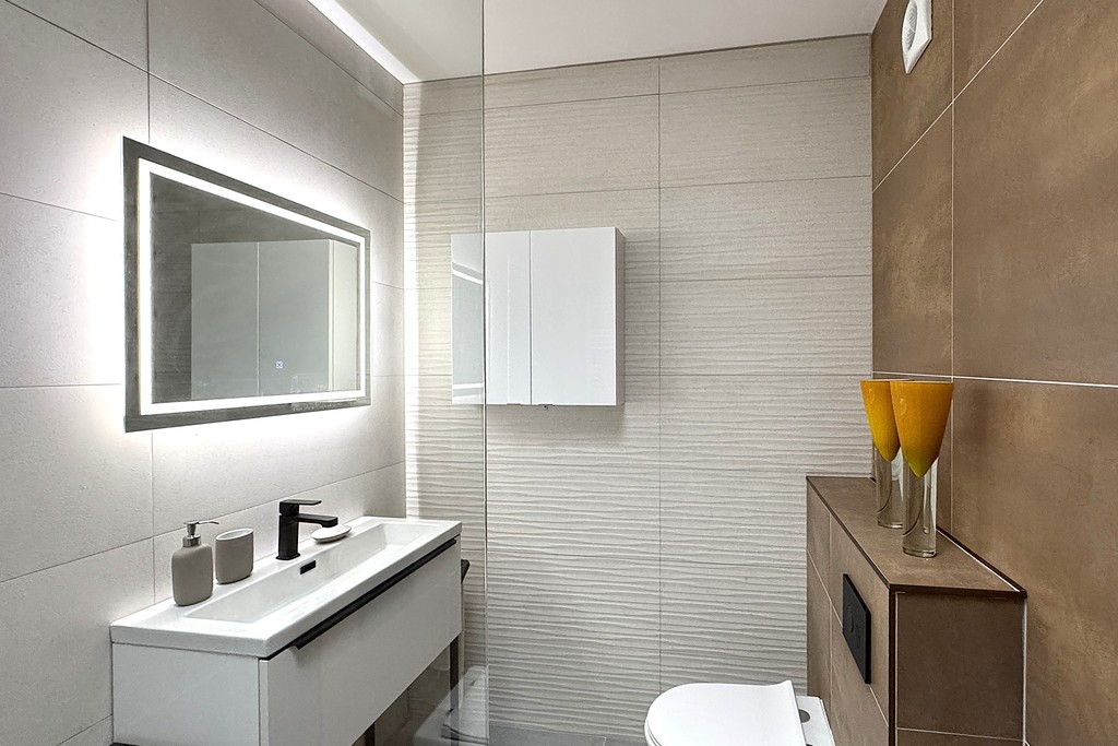 SHOWER ROOM 5' 7" x 8' 5" (1.72m x 2.58m) Comprising of a double walk-in shower cubicle with fixed waterfall shower head and shower riser, vanity unit wash hand basin with illuminated mirror above, dual flush WC, heated towel rail and bathroom cabinet. Velux window allowing natural light to filter in, LED lighting and Italian tiled walls and flooring.