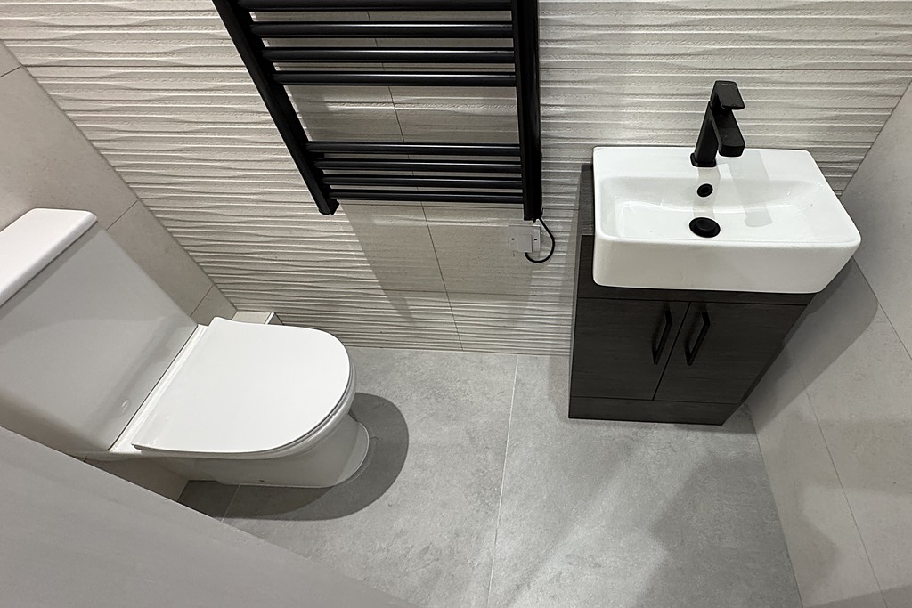 CLOAKROOM 2' 7" x 5' 9" (0.8m x 1.76m) Comprising of a dual flush WC, vanity unit wash hand basin and a heated towel rail. Tiled walls and tiled floor.