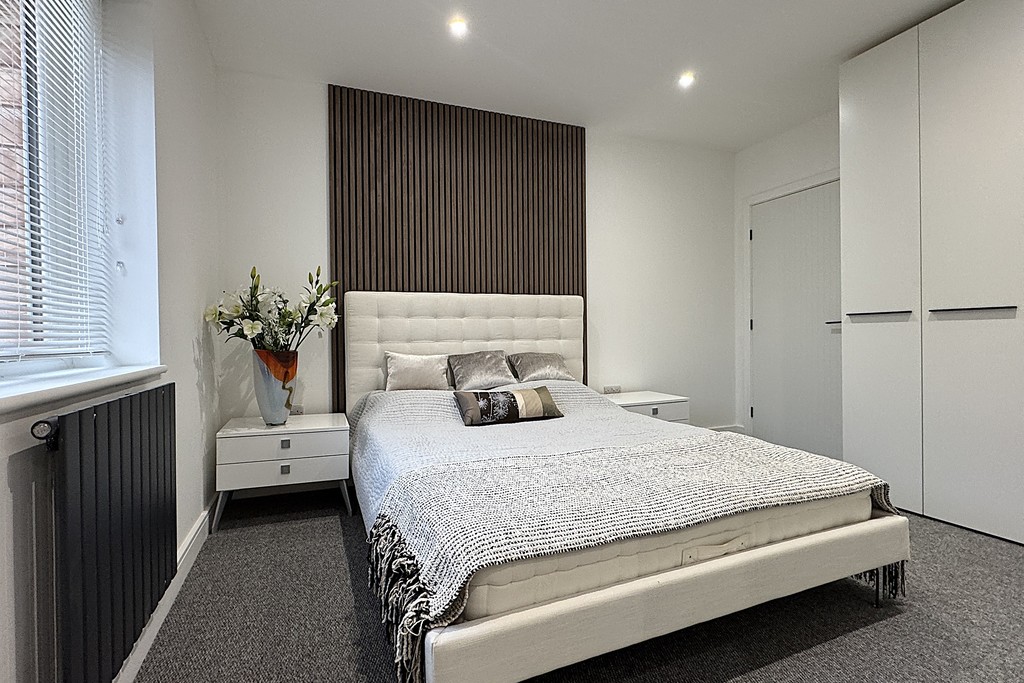BEDROOM ONE 12' 8" x 10' 1" (3.88m x 3.09m) This serene bedroom enjoys natural light from a rear-facing window with fitted blind and an additional Velux ceiling window, creating a bright and airy atmosphere. Fitted wardrobes offer practical storage, while a feature slatted wood panel adds a touch of contemporary character. Soft carpet underfoot enhances comfort, complemented by inset LED lighting and a wall-mounted radiator. A door leads directly to the ensuite, adding convenience and privacy.