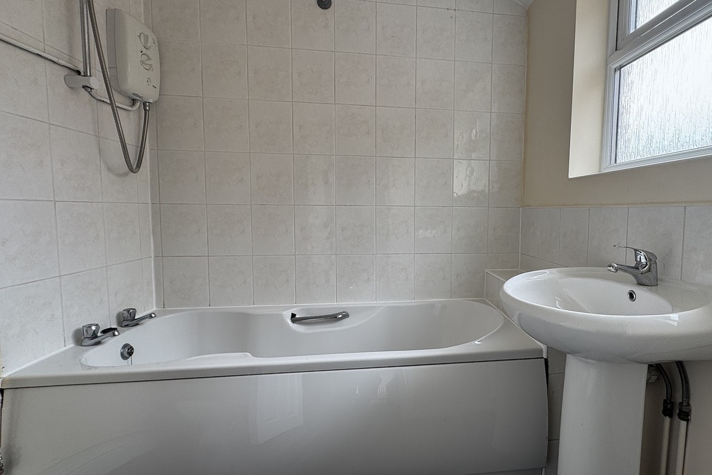 BATHROOM 6' 4" x 6' 2" (1.95m x 1.88m) Comprising of a panel bath with shower over, pedestal wash hand basin and a low flush WC. Obscure glazed window for privacy, radiator and part tiled walls.