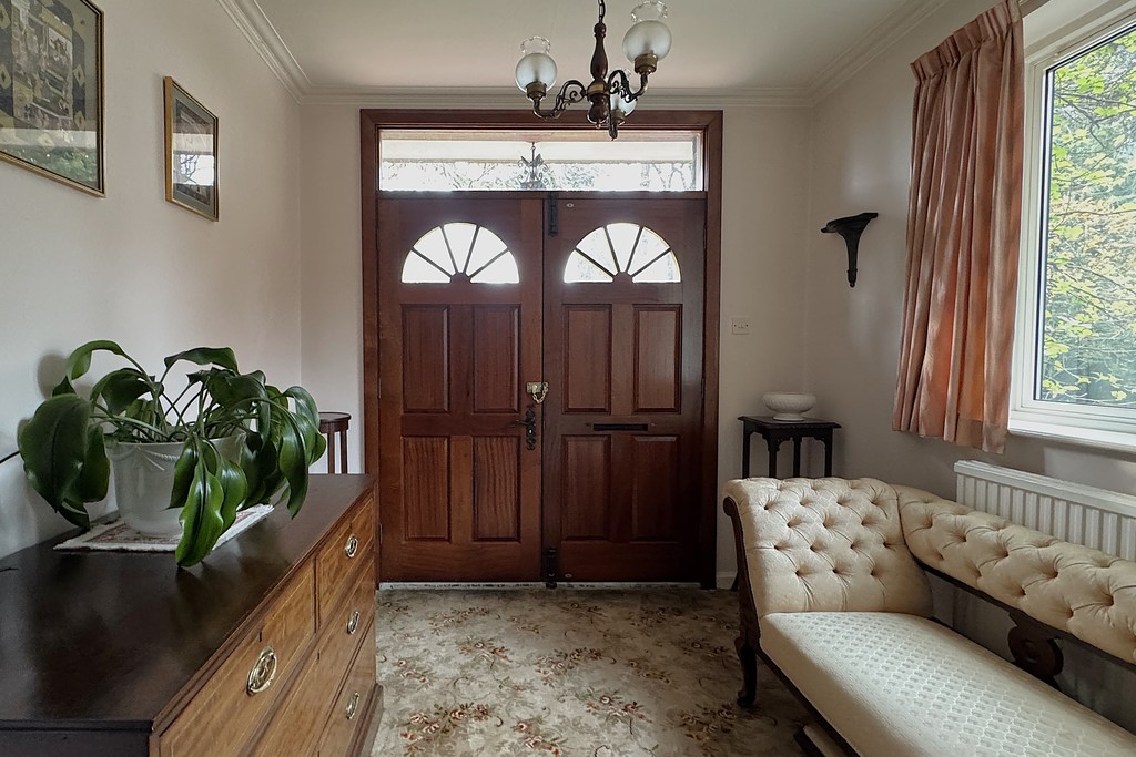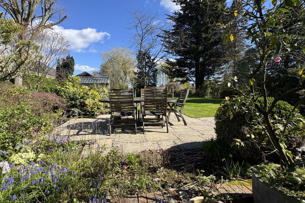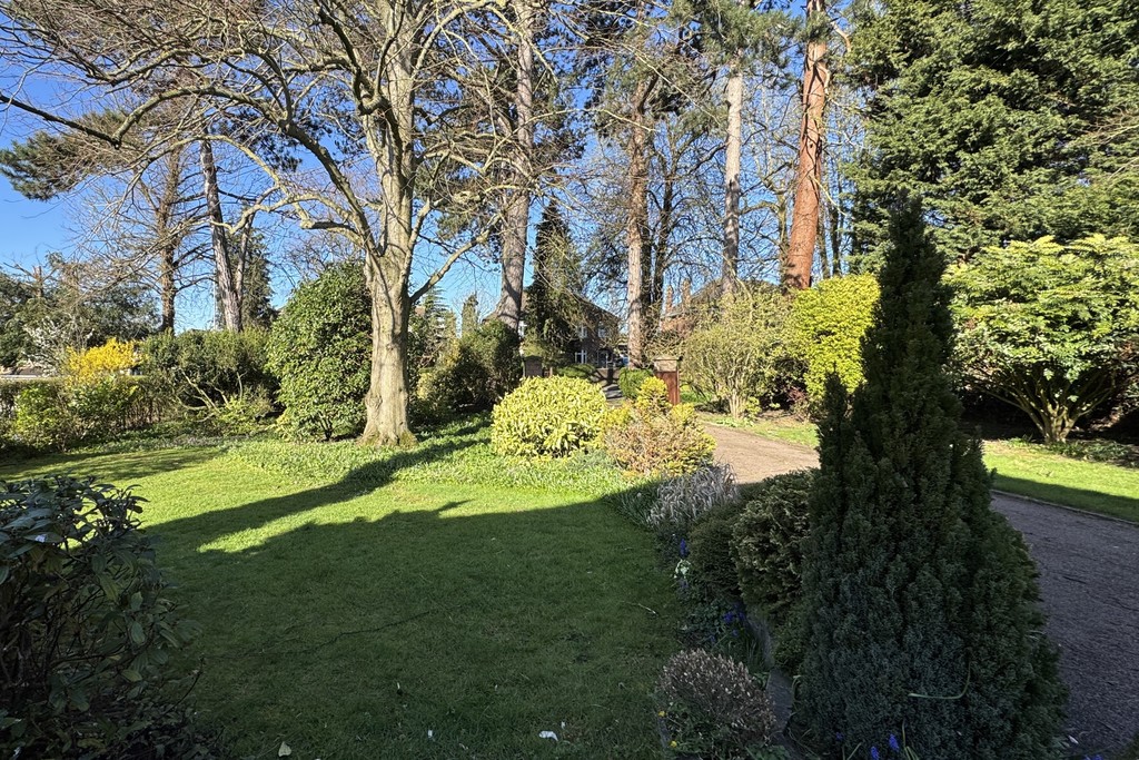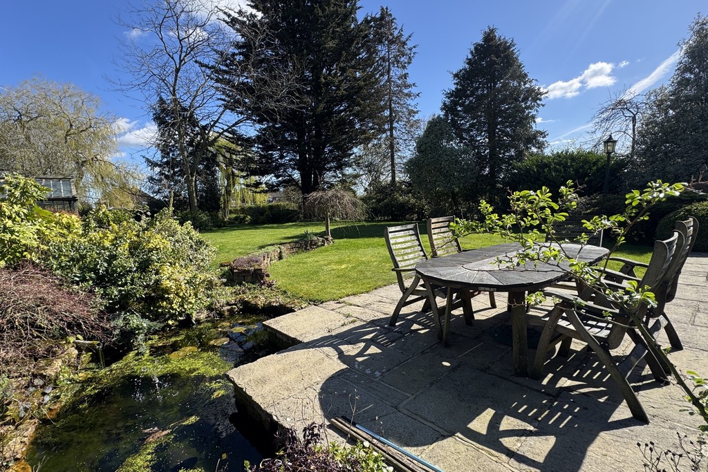 GARDENS The beautifully landscaped grounds wrap around the property, planted with established shrubs and mature trees, including protected Pine Redwood and Spruce trees. Double gates open onto the front driveway, leading to the first garage and continuing along the side of the property to the rear garage, offering excellent parking and storage options. A charming storm porch with courtesy lighting frames the front doors, while to the rear you'll find a patio area overlooking a garden pond and enjoying views across the generous, well‑tended garden, a peaceful spot to unwind and take in the surroundings.