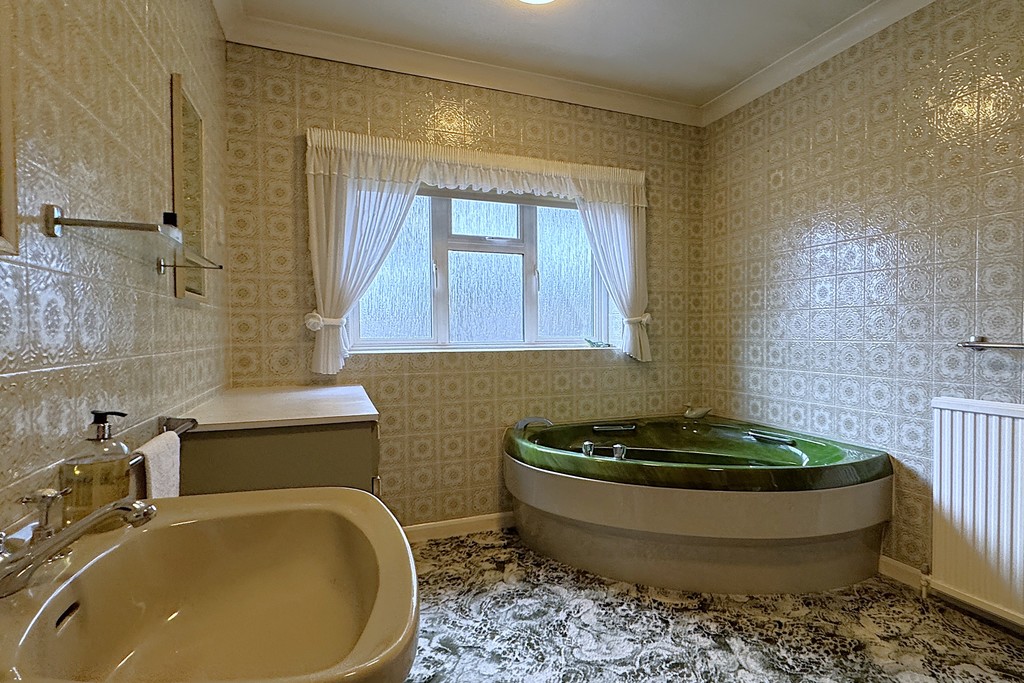BATHROOM 11' 3" x 8' 4" (3.43m x 2.56m) Comprising of a corner bath, shower cubicle, pedestal wash hand basin and fitted drawers. Obscure glazed window for privacy, electric shaver point, radiator and carpet flooring.