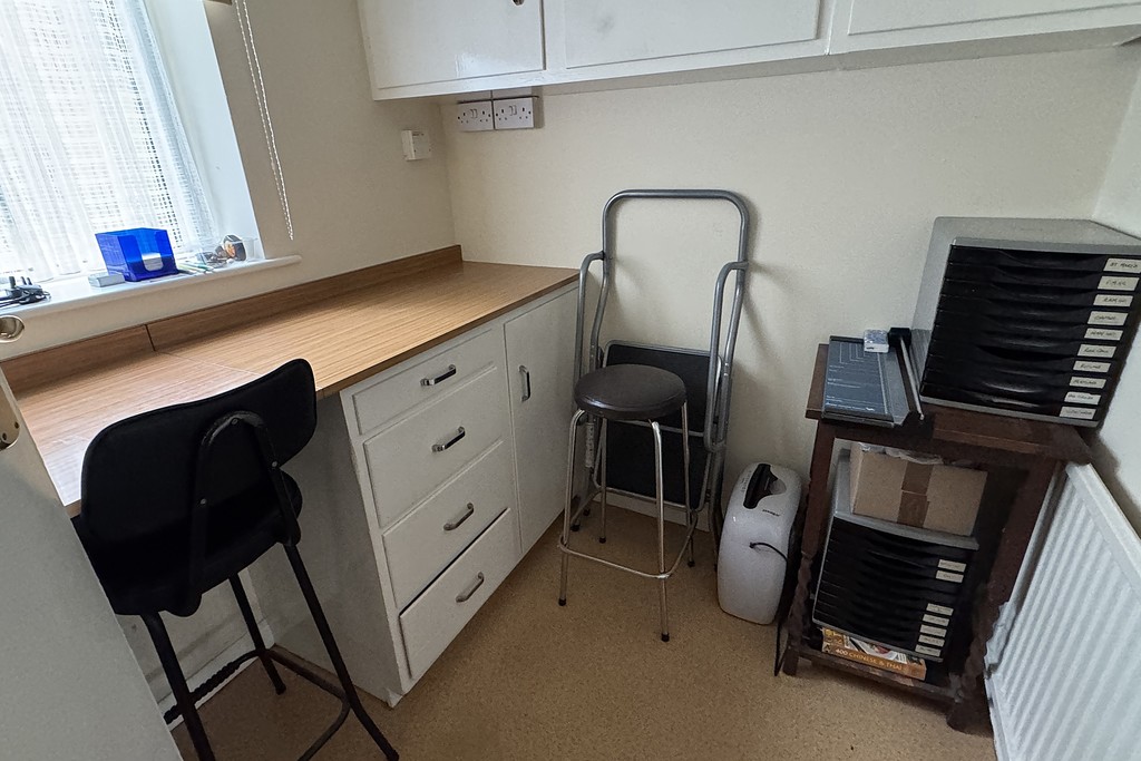 OFFICE 5' 10" x 6' 11" (1.78m x 2.12m) Having fitted desk and drawers, wall units, radiator, front facing window and vinyl flooring.