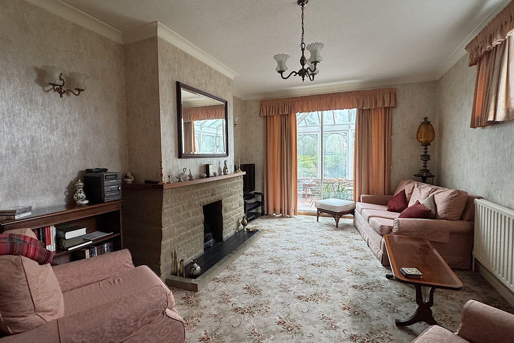 SITTING ROOM 11' 8" x 18' 11" (3.58m x 5.78m) Having a patio doors to the conservatory and a window to the side, radiator, stone fireplace with a gas fire, carpet flooring and a door to the inner hallway.